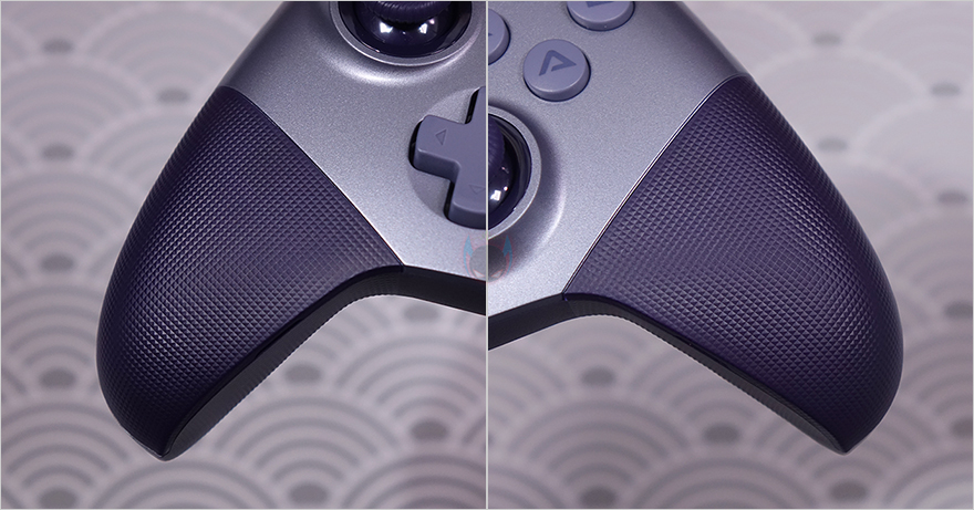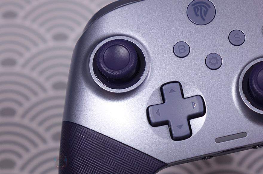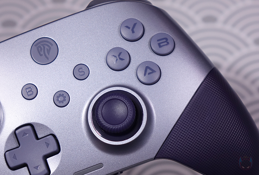 버튼을 중심으로 왼쪽으로는 왼쪽 조이스틱(Left-Joystick)과 방향키 패드가 배치되어 있는데, 방향키 패드 같은경우 내부에는 메탈(Metal) 소재의 돔(Dome)을 적용해서 좀 더 내구성을 높이고 버튼 조작시 클릭 체감도 높였습니다. 그리고, 반대편인 오른쪽에는 A/B/X/Y 버튼과 오른쪽 조이스틱(Right Joystick)이 배치되어 있는데, A/B/X/Y 버튼 역시 앞서 제품박스 주요 특징에서 확인했듯에 내부에 기계식 스위치를 적용했습니다. 정확히는 마우스에 사용되는 택타일 스위치(Tactile switch)죠. 그래서, 왼쪽에 있는 방향키 패드와 A/B/X/Y 버튼을 직접 눌러보면 확실히 일반 게임 컨트롤러의 클릭 체감보다 좀 더 생동감이 있습니다.