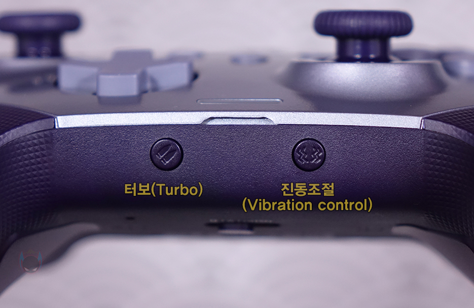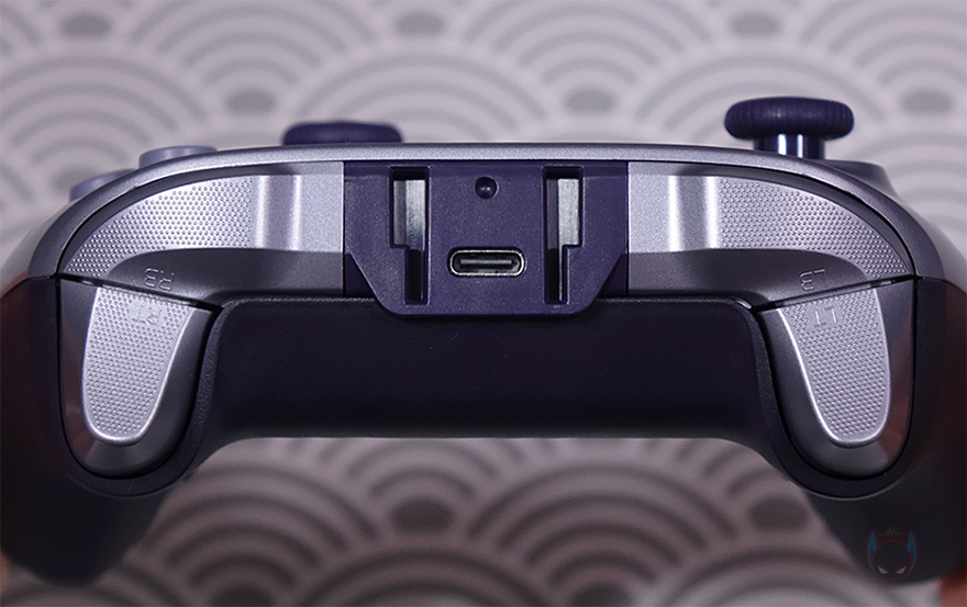 또한, 중간 맨 아래 연결상태를 확인할 수 있는 LED 인디케이터 아랫부분에는 터보(Turbo)와 진동(Vibration) 조절 버튼이 배치되어 있는데, 진동조절은 25% 단위씩 0~100%까지 5단계로 조절할 수 있습니다. 그리고, 왼손과 오른손 그립이 되는 부분에는 접지력과 미끄럼방지를 위해 표면에 엠보싱(embossing) 처리를 해놨습니다. 컨트롤러 전면에는 중앙에 유선과 충전으로 사용되는 기본 제공의 USB Type-C 케이블과 연결되는 Type-C 포트가 적용되어 있으며, 양쪽으로 각각 왼쪽 LB(Left Bumper), LT(Left Trigger) 버튼과 RB(Right Bumper), RT(Right Trigger) 버튼이 적용되어 있는데, LB와 RB 버튼 역시 스위치를 적용해 생동감을 높였습니다.