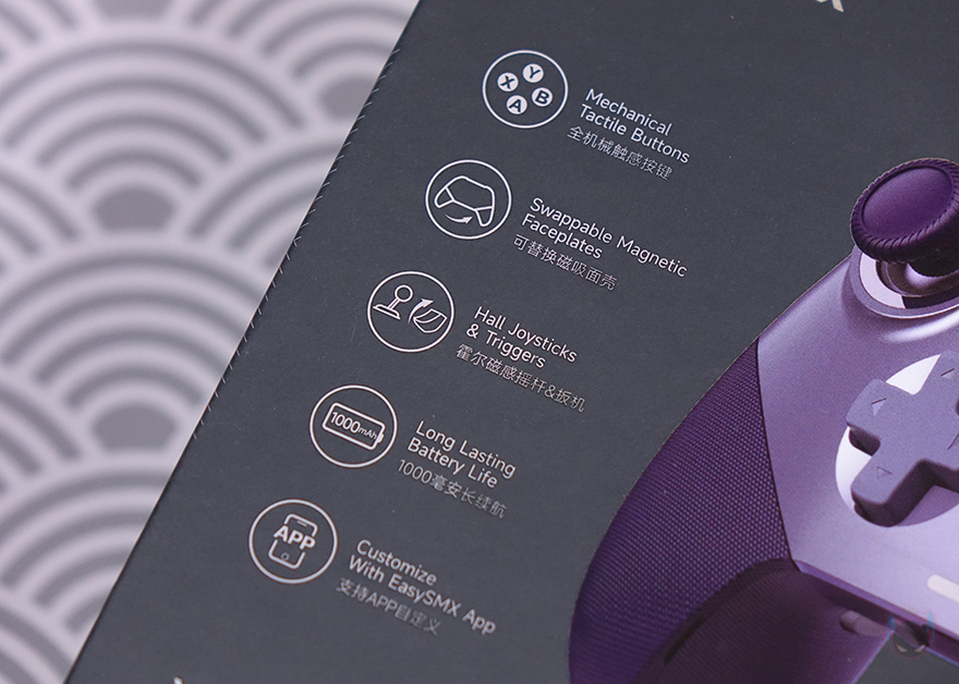 다시 본론으로 돌아와 제품박스부터 살펴보면, 패키지 포장은 박스 전체까지 밀봉처리가 되어있으며, 박스 전면에는 모델명과 함께 제품 이미지를 담고 있어서 제품 디자인을 미리 확인할 수 있습니다. 뒤에서 다시 언급하겠지만, X10은 2가지 색상으로 나왔습니다. 그리고, 이미지 왼쪽에는 주요 특징들을 표기해놨는데, 기계식 택타일 버튼, 교체식 페이스플레이트(Faceplates), 홀 조이스틱과 트리거, 긴 사용시간 배터리, 전용어플(App) 지원을 확인할 수 있죠. 모두 뒤에서 하나씩 살펴볼 부분입니다.