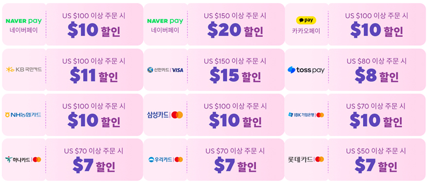 물론, 이번 알리익스프레스 14주년 애니버서리 할인행사는 상반기 최대 할인행사인만큼 결제할인과 할인코드도 모두 제공된다. 특히, 결제할인은 카드사, 페이 모두 적용되는데, 각 카드사별과 페이별로 가격대 한 번씩 사용할 수 있으며, 네이버 페이가 가장 큰 할인으로 가장 빨리 소진될 것으로 예상된다. 또한, 이번에 조금 달라진 할인부분도 있는데, 바로 그동안 금액대별로 자동할인되던 부분이 이번에는 원화(KRW)로 결제했을시에만 적용이 된다. 그래서, 달러와 원화로 결제했을 때 할인율 차이가 발생하기때문에 이부분도 고려해서 소바자는 결제를 선택해야한다. 달러와 원화 공용으로 사용되는 할인코드는 아래와 같으며, 원화 결제시 자동할인율도 아래 참고하기 바란다.