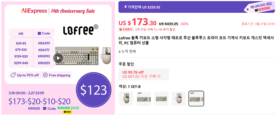 위에서도 소개했던 로프리(Lofree)는 이번 알리 애니버서리 세일에 또다른 무선 키보드와 마우스 세트 상품을 할인하고 있는데, 바로 Block 키보드와 Touch PBT 마우스다. 둘 다 이미 레트로감성 키보드와 마우스로 유명한데, 이번에 피스커뮤에 입수한 35달러 독립 할인코드가 있으니 더 저렴하게 구입하기 바란다.
