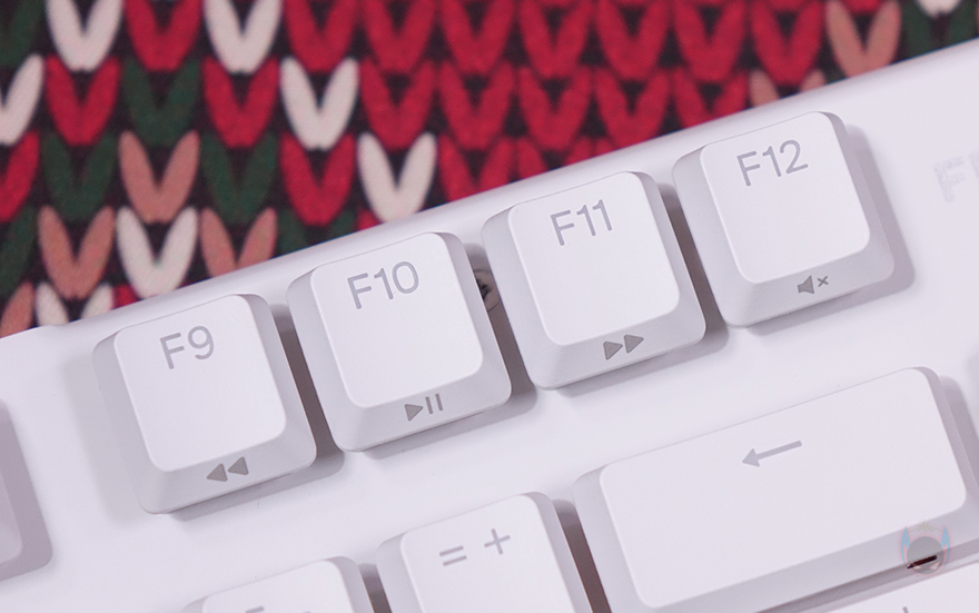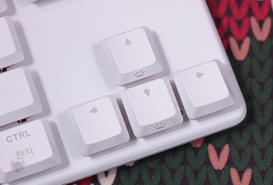 스트릭80 LP 역시 다른 기계식 키보드처럼 Fn키를 갖추면서 부가기능도 지원하는데, F9~F11키까지는 미디어 컨트롤, F12키는 음소거, 특수키들은 앞서 언급했던 노브(Know) 컨트롤 자리로 빠진 3개의 특수키를 Fn키 조합으로 사용할 수 있게 지원하면서, Delete키는 RGB 모드 전환 시작, End키는 Fn키 잠금/해제, PageDown키는 프로파일 기능을 가졌습니다. 그리고, 방향키는 상하 방향키만 밝기조절로 표기되어 있는데, 좌우 방향키도 방금 언급한 Fn+Delete키로 RGB 모드 전환을 실행하면 좌우 방향키를 통해 모드 선택을 할 수 있습니다. 참고로 ESC키 역시 Fn키 조합으로 기능을 지원하는데, 게임플레이 발생하는 윈도우키 눌림 등의 키 방지 기능입니다.