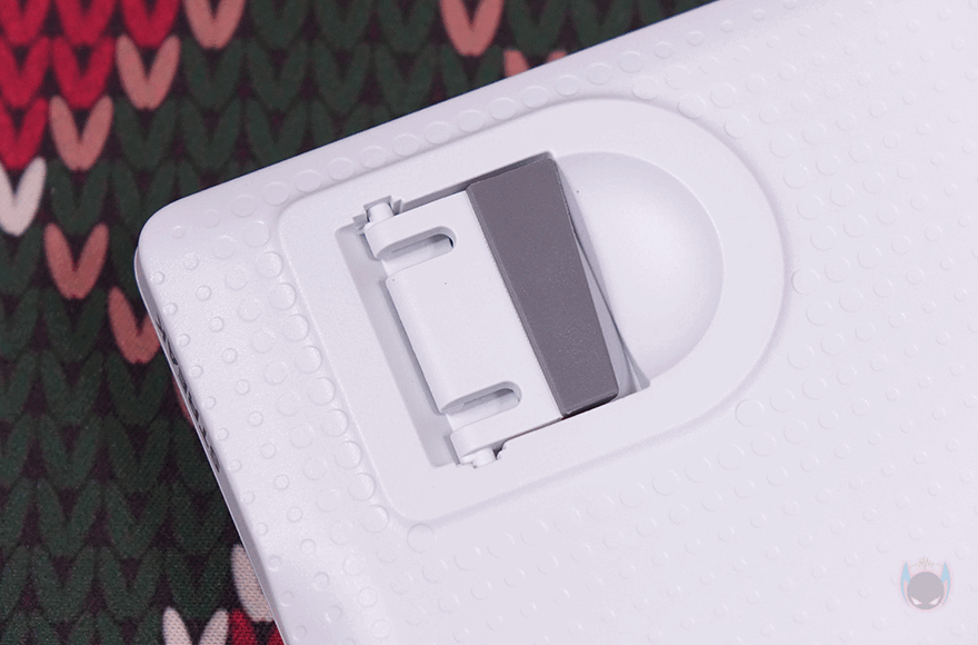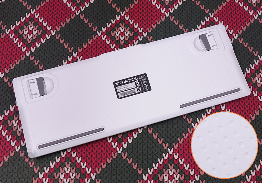 키보드 밑바닥부분에는 가까이에서 보면 표면에 일정 패턴 디자인을 적용했으며, 앞부분에는 양쪽으로 높낮이 받침대가 적용되어 있는데, 앞방향으로 접었다 펼치는 방식이 아닌 옆으로 접었다 펼치는 방식으로 나름 차별성을 주었습니다. 물론, 받침대 부분에는 고무패드가 적용되어 있으며, 밑바닥 아랫부분에도 길게 패드가 부착되어 있죠. 그리고, 키보드 측면에서 보면 로우-프로파일 스위치 콘셉트 키보드답게 높이가 낮은 것을 확인할 수 있는 동시에 낮은 높이임에도 다른 기계식 키보드처럼 타이핑에 최적화라 불리는 스텝-스컬처 2 단계배열을 적용하고 있습니다. 물론, 높낮이 받침대가 있기 때문에 너무 낮으면 높여서 사용할 수 있죠.