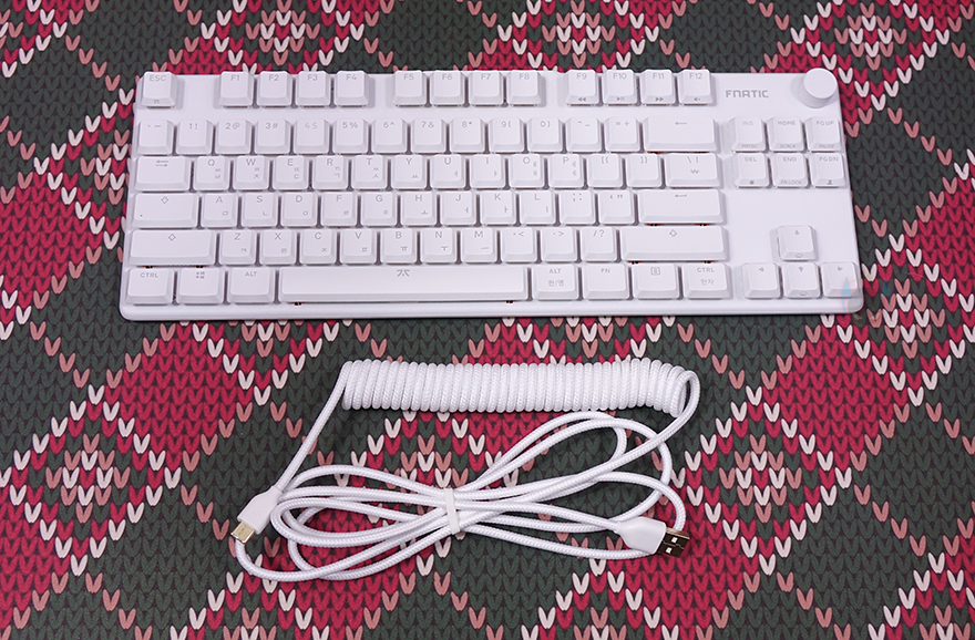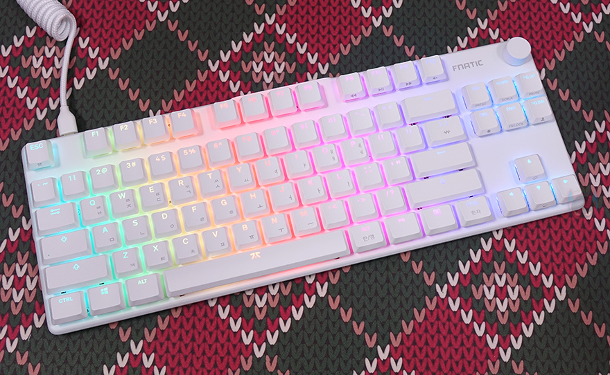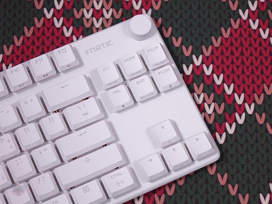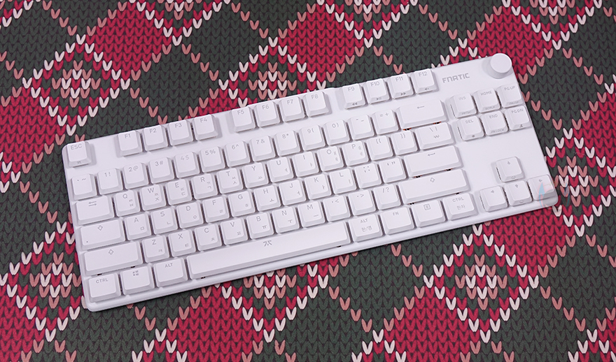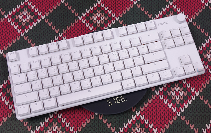 그럼, 본격적으로 프나틱(Fnatic)의 스트릭80 LP 기계식 키보드를 살펴보는데, 키보드 색상은 올-화이트이며, 앞서 패키지에서 잠깐 언급했듯이 키보드 배열은 텐키리스(Tenkeyless)입니다. 맨 오른쪽에 숫자키패드가 빠진 전형적인 87 키에서 맨 윗부분에 배치되는 특수키 3개까지 빠진 84 키 배열이죠. 그리고, 특수키 3개가 빠진 맨 윗부분 자리에는 요즘 키보드 트렌드 중 하나인 노브(Knob) 컨트롤러를 적용했습니다. 물론, 노브는 볼륨조절 및 음소거 기능을 가졌죠. 그리고, 키보드 무게는 스펙상에 근접하는 약 580g을 가졌습니다.