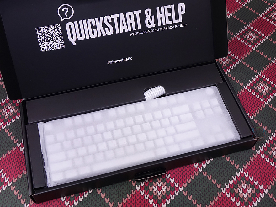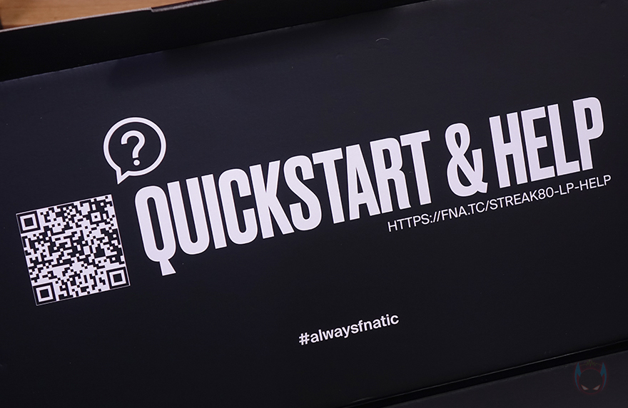 패키지 측면에는 속박스 측면을 볼 수 있는데, 한글 자판 레이아웃 표기와 제품의 기본 사양 표기를 확인할 수 있습니다. 사양 표기에는 키보드 크기부터 무게, MCU, 온보드 메모리, 스위치 등 핵심부분을 표기해 놨으며, 오리지널 동봉씰과 국내 정발 제품으로 정식수입사의 동봉씰까지 이중으로 부착된 것도 확인할 수 있죠. 커버를 벗기고, 속박스를 열어보면, 프나틱은 예전부터 키보드 포장에 종지 포장재를 사용했죠. 프나틱이 유럽 브랜드인 만큼 친환경정책으로 예전부터 적용했습니다. 그리고, 키보드와 케이블을 제외하면 제품설명서나 퀵-가이드 같은 구성품이 없는데, 이 역시 친환경정책으로 홈페이지에서 볼 수 있도록 속박스가 열리는 안쪽에 QR코드를 표기해 놨죠. 그래서, 전체 구성품은 방금 언급했듯이 스트릭80 LP 키보드와 분리형 USB 전원케이블만 있습니다.