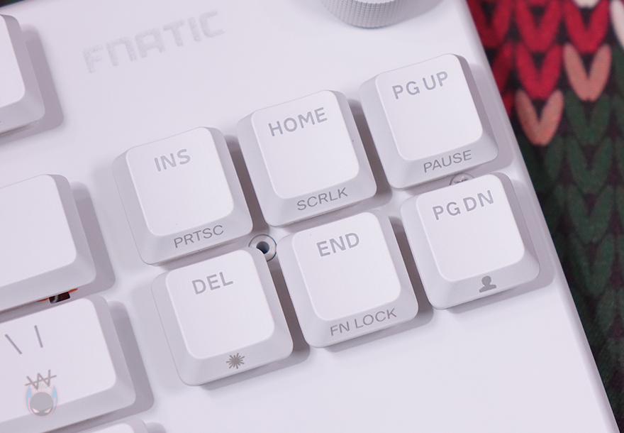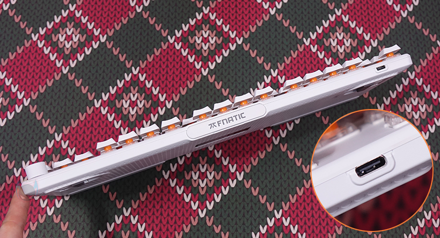 키보드 전면 한쪽에는 함께 제공되는 분리형 USB 전원케이블과 연결되는 USB 타입C 포트가 배치되어 있으며, 중앙 부분에는 Fnatic 로고가 새겨져 있는데, 예전부터 프나틱은 키보드 로고 부분에 커스텀으로 사용자가 변경할 수 있게 분리형으로 적용했죠. 이번 제품 역시 자석방식으로 로고 부분이 분리가 가능합니다. 그래서, 언제든지 사용자가 커스텀 디자인으로 변경할 수 있고, 키 스위치의 RGB 라이트닝 효과와 동일하게 작동되도록 로고 위치 내부에도 LED가 적용되어 있죠.