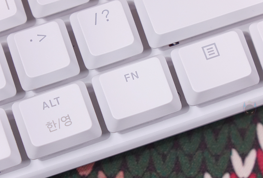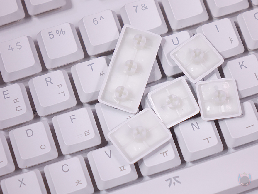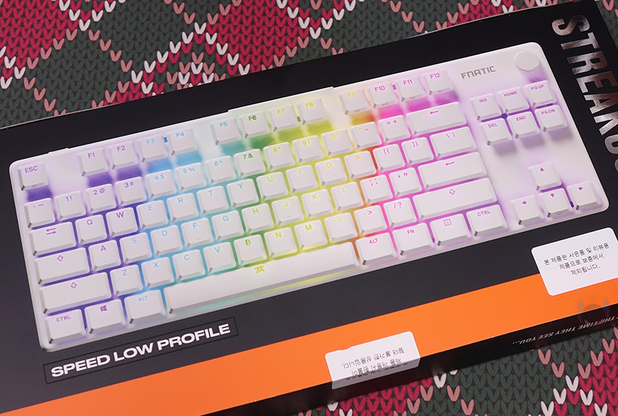 키 스타일은 키캡 아래가 노출된 비키(viki) 스타일이며, 앞서 제품 이름에서 언급했듯 스트릭80 LP는 로우프로파일 콘셉트를 가졌습니다. 쉽게 말해, 스위치가 로우-프로파일이라는 거죠. 그래서, 키캡 역시 여기에 어울리는 낮은 높이의 키캡을 가졌는데, PBT 이중사출방식으로 국내시장에 맞게 한글 자판까지 적용되었습니다. 스위치는 스위치 박스에 카일(Kailh)이라고 표기되어 있지만, 카일에는 없는 스위치 즉, 프나틱(Fnatic) 자체 커스텀의 로우-프로파일 스위치로 스위치 작동거리가 일반 로우-프로파일보다 20% 줄어든 1.0mm에 불과하고 깊이를 그대로 3.2mm를 가진 리니어 타입입니다. 쉽게 말해, 스피드 리니어 로우프로파일 스위치라는 거죠. 물론, 기본 베이스는 카일에서 가져왔기 때문에 키 수명은 5천만 회를 가졌고, 스페이스-바 같은 긴 키들의 스테빌라이저는 체리식입니다.