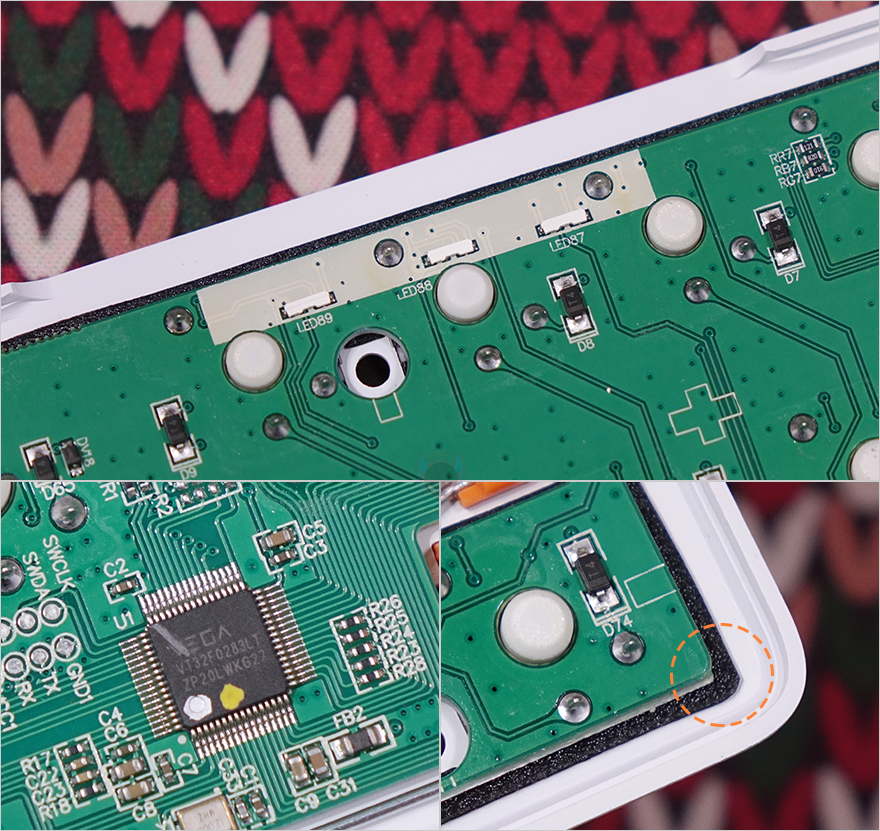 프나틱 스트릭80 LP 기계식 키보드는 키캡과 노브를 모두 빼내면, 화이트 색상의 알루미늄 메탈 상판에 고정된 나사들을 확인할 수 있는데, 위치한 나사들과 후면 받침대 안쪽에 보이는 나사까지 풀면, 쉽게 키보드 분해가 가능합니다. 스트릭80 LP 키보드를 분해해서 잠깐 살펴보면, 앞서 언급한 전면 로고 부분의 LED 효과를 볼 수 있게 내부에 LED가 적용된 것을 직접 확인할 수 있으며, MCU는 앞서 스펙사양에 표기된 것처럼 VEGA사 칩셋이 적용되었으며, 스위치와 PCB기판 분리는 안되지만, 테두리 부분에서 두 사이에 소음을 줄이도록 필름이 적용된 것을 간접적으로 확인할 수 있고, 키보드 케이스 하판 내부에는 흡음재가 적용된 것도 확인할 수 있습니다.