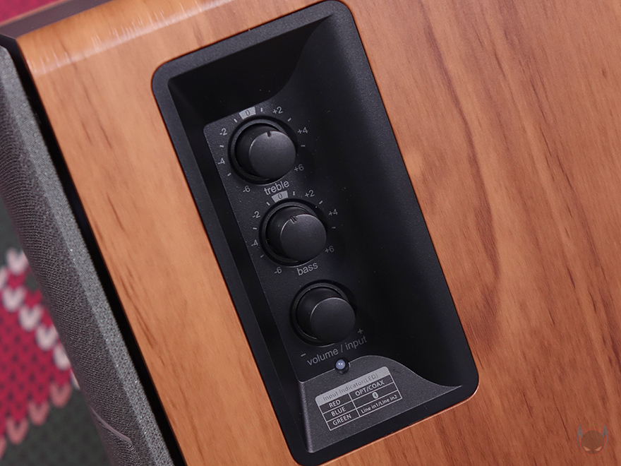 이번엔 앰프가 내장된 액티브(Active) 스피커를 살펴보는데, 측면에는 다이얼(Dial) 컨트롤러가 배치되어 있습니다. 위에서부터 고음조절의 트레블(Treble), 그 아래 저음조절의 베이스(Bass), 그리고 그 아래에는 볼륨조절 다이얼이 배치되어 있죠. 트레블과 베이스 다이얼은 0을 기준으로 -와 + 단계로 각각 6단계씩 조절이 가능하고, 볼륨조절 다이얼은 돌리면 볼륨조절이 되고, 버튼식으로 누르면 사운드 입력모드를 전환할 수 있습니다. 입력모드 상태는 다이얼 바로 아래에 LED 인디케이터를 통해 확인할 수 있고, LED 아래에 친절하게 색상별 입력모드 설명을 표기해놨습니다.