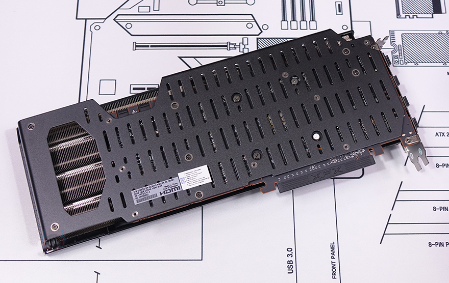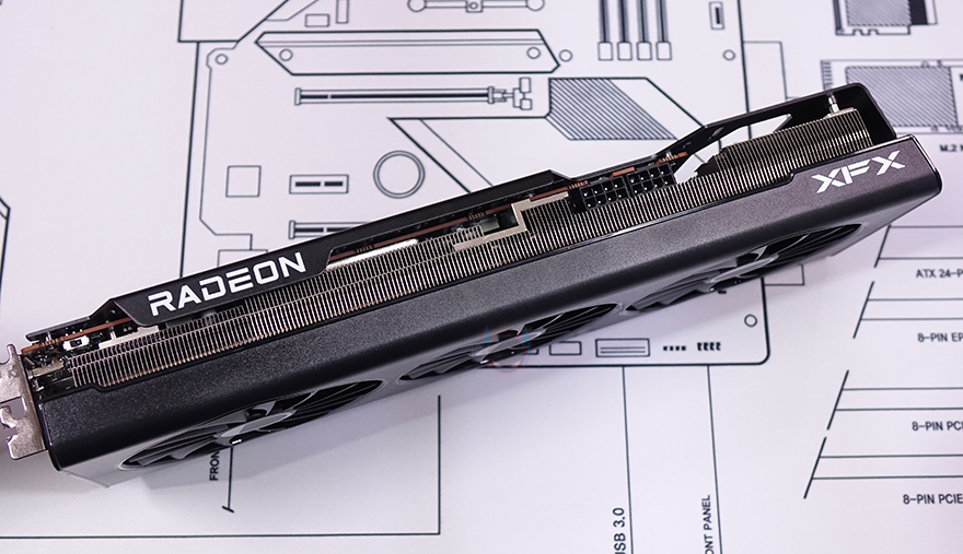 측면에서 보면 쿨러 높이는 2단 PCI슬롯보다 약간 더 높지만, 2.5배 슬롯까지는 아닙니다. 그리고, PCI가이드 부분에는 포트와 여백 부분에 에어홀 처리르 해놨으며, 쿨러 측면에서 보면 내부에 쿨러 커버안쪽으로 장착된 촘촘한 방열핀 배열을 확인할 수 있는 동시에 XFX와 라데온 로고 표기도 처리되어 있고, 파워서플라이와 연결되는 PCIe 보조전원 8핀 커넥터 2개 배치도 확인할 수 있죠. 그리고, 그래픽카드 후면에는 백플레이트가 기본 장착되어 있는데, 일정 간격의 패턴 디자인 에어홀과 보조전원 커넥터 위치 주변에는 큼지막한 에어홀 처리를 해놨습니다. 또한, 쿨러와 백플레이트 간격도 측면에서 보면 쿨링효과를 위해 간격을 두고 있죠. 모니터 출력 포트에는 HDMI 2.1버전 포트1개, DP(디스플레이포트) 2.1버전 포트 3개를 갖추고 있습니다. 사용하지 않는 포트는 부식방지를 위해 커버도 기본제공해주고 있죠.