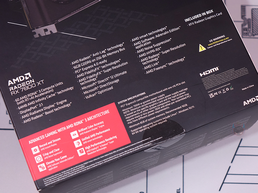 제품 이미지는 박스 후면에서 확인할 수 있는데, 해당 제품의 그래픽카드 디자인을 앞뒤 이미지로 담아 간접적으로 먼저 확인이 되는데, 방금 언급했던 트리플-팬도 미리 확인이 됩니다. 물론, 가격대와 성능이 있는 제품이니깐 백플레이트도 기본 적용된 것을 알 수 있죠. 그리고 제품 이미지 아래에는 AMD 라데온 RX 7800 XT 기반으로 지원되는 AMD 그래픽 기술지원 표기를 확인할 수 있습니다.