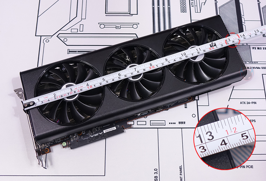 그럼, 본격적으로 XFX 라데온 RX 7800 XT Qick 319 Core 그래픽카드를 살펴보는데, 전체 색상은 블랙이며 앞서 시작에서 잠깐 언급했듯이 최근에 화이트 색상이 추가로 출시되었습니다. 물론, 색상이 구분되는 곳은 쿨러와 백플레이트입니다. 그리고, 트리플-팬이 적용된 쿨러를 장착한 만큼 그래픽카드 전체 길이도 약 340mm 긴 편입니다. 쿨러에 장착된 3개의 팬은 가운데 팬과 양쪽 팬 크기가 서로 다른데, 가운데 팬은 90mm, 양쪽 팬은 100mm 크기를 가졌습니다.