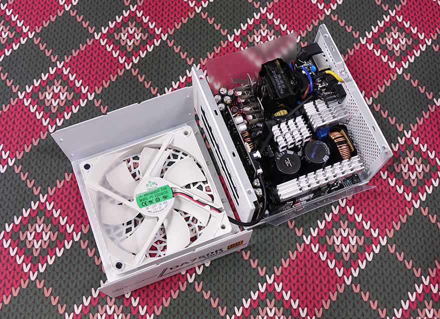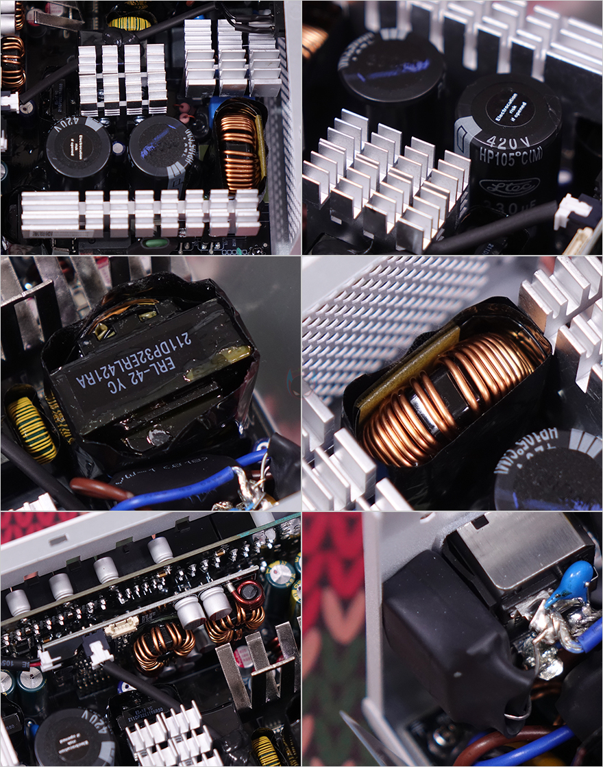 실버스톤 DA750R Gold 파워서플라이 내부를 잠깐 살펴보면, 내부에 장착된 120mm 팬은 외형 색상에 맞춰 화이트 팬(White Fan)을 장착했으며, 공기흐름을 위해 에어가이드도 장착되어 있습니다. 또한, 팬 같은경우에는 기본 베이스는 Poweryear 팬을 사용했지만, FDB 베어링 팬으로 제품에 맞춰 저소음으로 커스텀한 팬으로 실제 팬 최대속도는 베이스 모델보다 낮은 1500 RPM대로 저소음을 구현했습니다. 이외에도 내부에 발열해결을 위한 알루미늄 히트싱크(Heatsink)를 비롯해, 메인 캐패시터는 105℃에서 견딜 수 있는 대만 LTEC사의 420V/330㎌ 용량 캐패시터 2개를 사용했으며, ActivePFC, EMI 필터, 팬 자동속도 조절 적용 등을 육안으로 쉽게 확인할 수 있습니다. 물론, 이밖에도 OCP(과전류보호), OPP(과전력보호), OVP(과전압보호), SCP(단락보호), UVP(저전압보호), OTP(과열보호) 6가지 보호회로도 적용되어 있습니다.