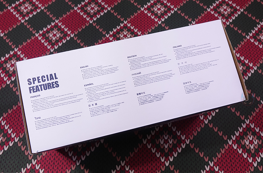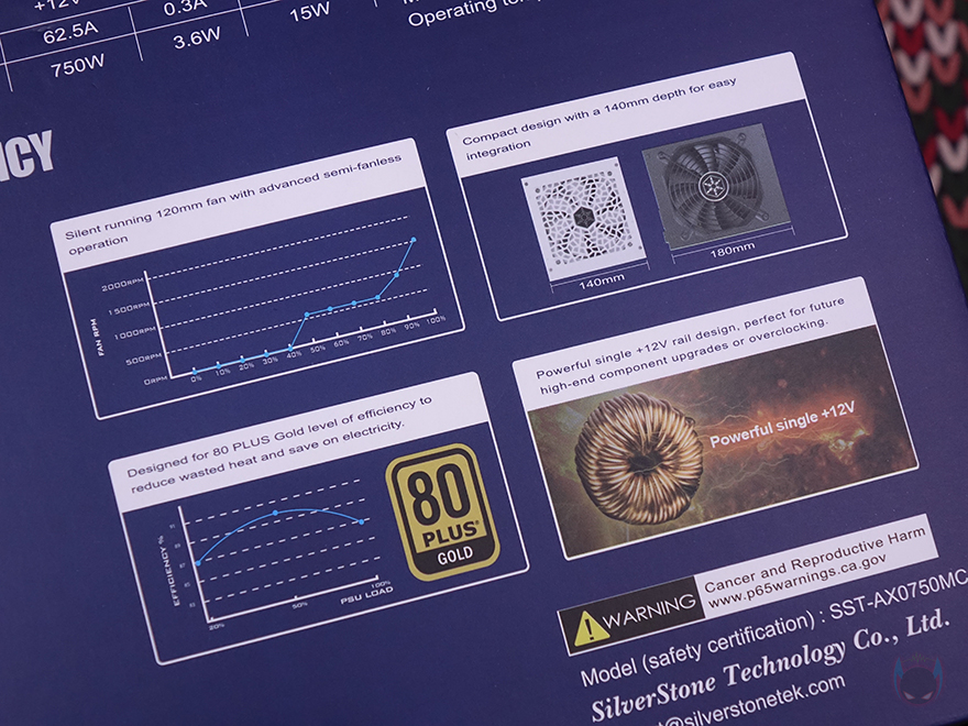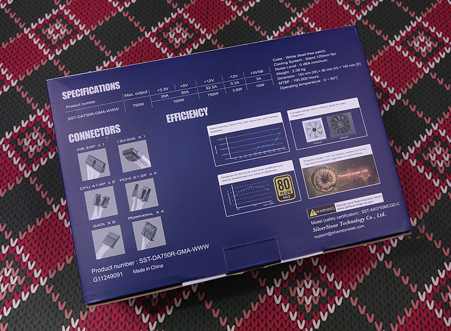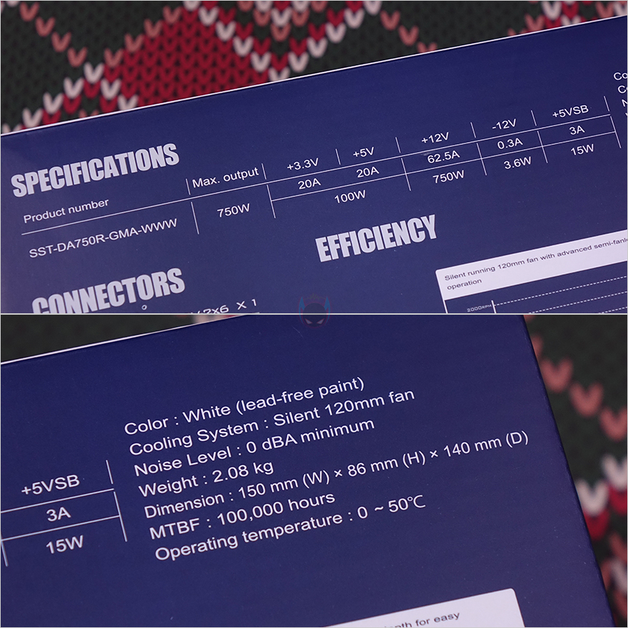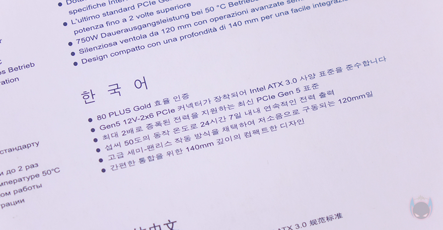 박스 한쪽 측면에는 주요 특징으로 방금 언급했던 특징 외에 듀얼 CPU 전원공급 지원, 저소음 120mm 팬, 플랫(Flat) 케이블 언급을 추가로 확인할 수 있으며, 또 다른 측면에는 각 나라별 언어로 특징을 표기해 놨는데, 한국어도 포함되어 있습니다. 박스 후면에는 제품의 기본 사양 표기를 확인할 수 있으며, 커넥터(Connectors) 구성과 저소음 120mm 팬, 컴팩트 깊이 길이, 80 Plus Gold 전력효율, 싱글 +12V 레일에 대한 언급을 좀 더 자세하게 담고 있죠.