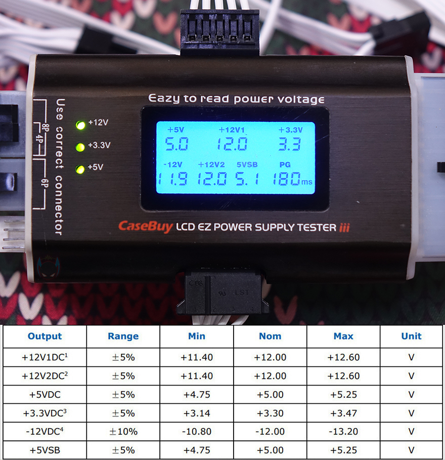 직접, 실버스톤(Silverstone) DA750R Gold 파워서플라이(PSU)를 사용해보면, 최근 소비자들에게 가장 인기가 좋은 AMD 라이젠 7800X3D CPU기반의 시스템에서 OCCT 프로그램을 통해 12V와 5V 전압 출력상태를 확인해 볼 텐데, 그전에 기본작동 상태에서 전체 전압 상태를 확인해 보면, 인텔 파워서플라이 가이드 범위에서 정상적으로 출력되는 것을 확인할 수 있습니다. 그리고, 앞서 본체 후면에서 언급한 에코(ECO) 스위치를 사용해 일종의 제로팬 모드를 On/Off 할 수 있죠. 에코 모드를 켜면, 일정온도에 도달하기 전까지 작동하지 않는 무소음 상태가 되고, 에코 모드를 끄면 처음부터 팬이 작동합니다.