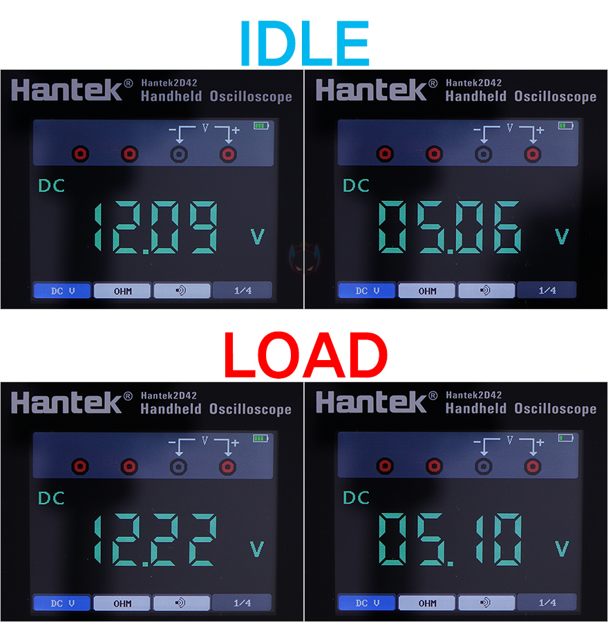그럼, OCCT 프로그램을 통해 DA750R Gold 파워서플라이의 12V와 5V 전압 출력상태를 확인해보는데, IDLE 상태일 때와 LOAD 상태일 때의 12V, 5V 전압 출력 상태를 각각 확인해 보면, IDLE 상태에선 12V와 5V 모두 0.01V 범위에서 거의 변동이 없으며, LOAD 상태에서 역시 12V와 5V 모두 0.01V 범위를 벗어나지 않습니다. 또한, 전체 변동폭도 12V는 0.13V, 5V는 0.04V 범위로 매우 작은 폭이며, 두 전압 모두 안정적으로 출력되는 상태를 확인할 수 있죠.