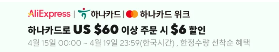 알리 4월 할인행사는 지난 달 3월이 상반기 중 가장 큰 행사였기때문에, 4월 행사는 규모가 작다. 일단, 결제할인은 하나카드만 진행되며, 60달러이상 구매시 6달러 할인을 해준다. 물론, 할인 규모가 작아도, 프로모션 할인코드는 당연히 나왔으며, 가격대별로 할인코드를 미리 잘 숙지하고, 구입 가격계획을 잘 세우면 평소보다 저렴하게 구입할 수 있으니, 아래 할인코드를 참고해놓자.