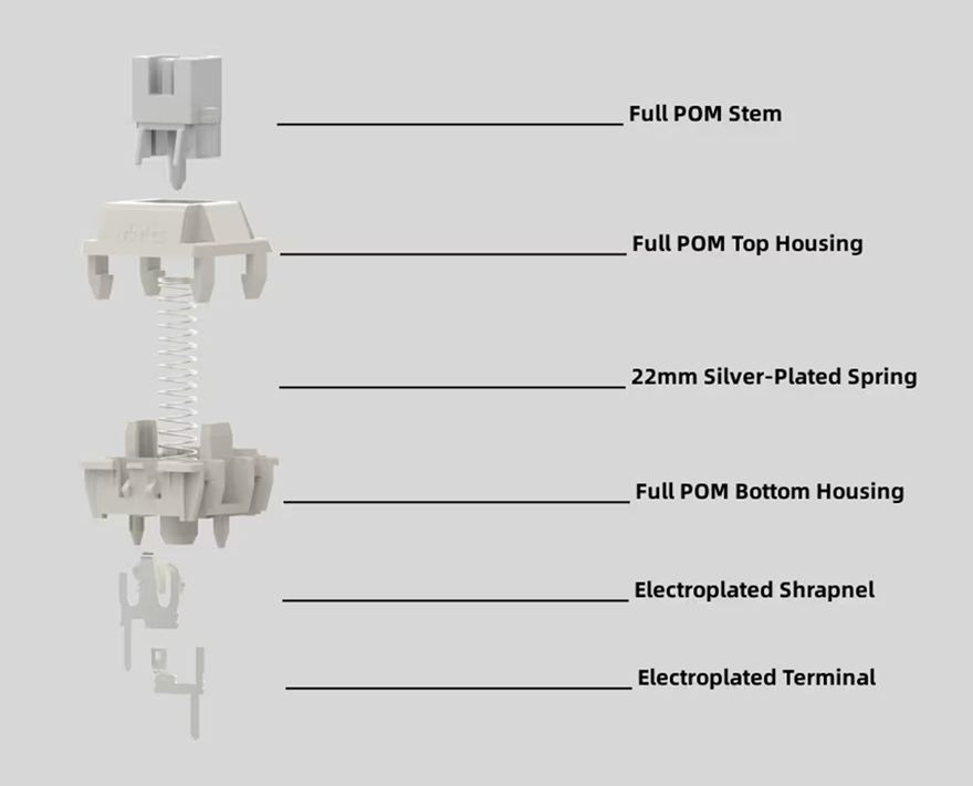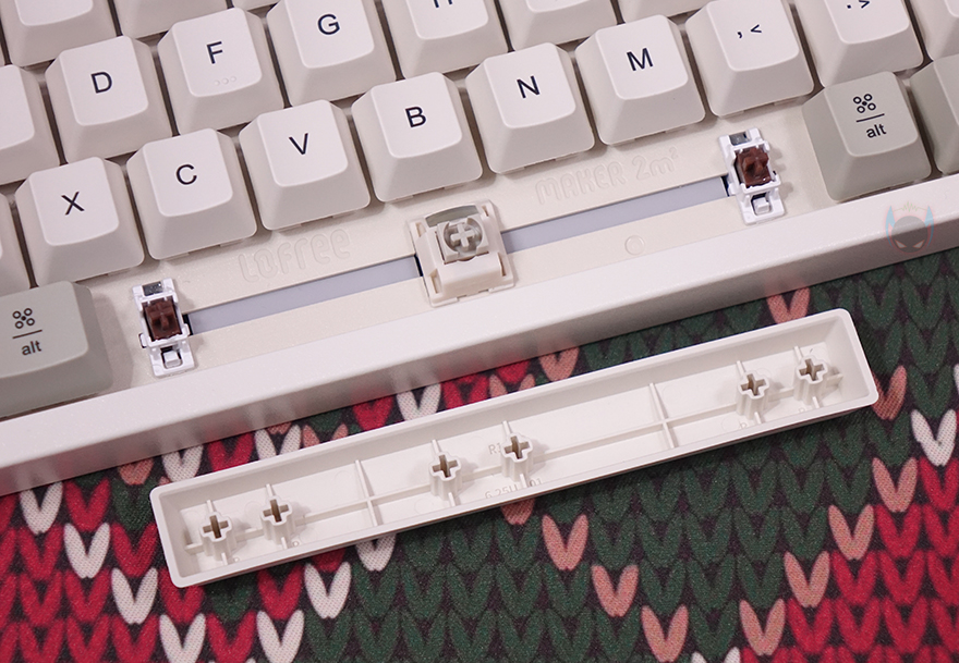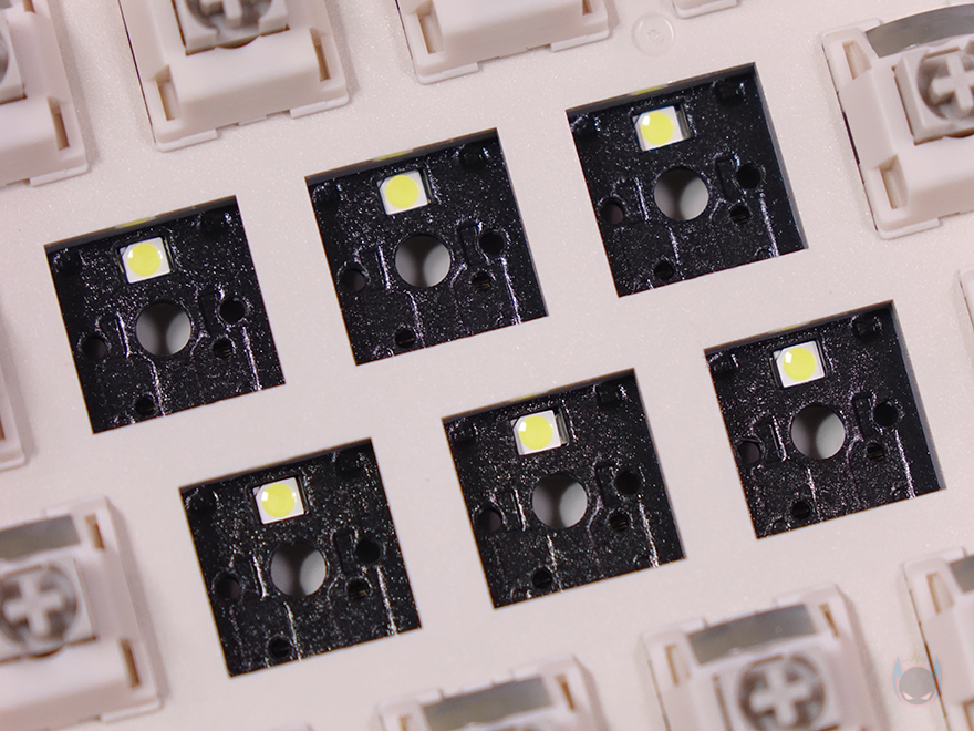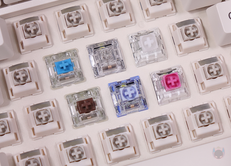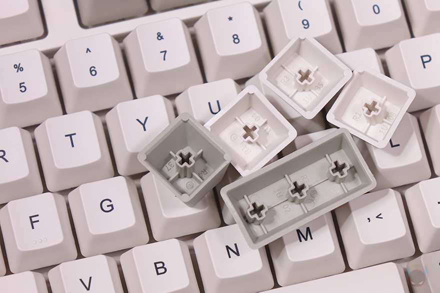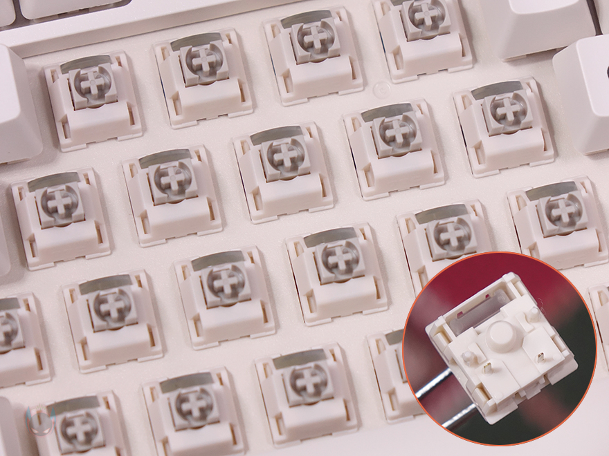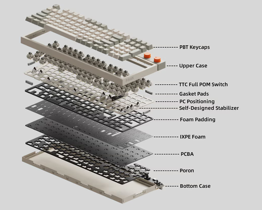 BLOCK 98 키보드는 키캡(Keycaps) 디자인도 평범하지 않습니다. 모든 키캡에 폰트 인쇄를 클래식한 폰트형태로 새겨놨으며, 키캡 또한, PBT 재질입니다. 스위치(Switch) 같은경우에는 TTC Full POM 스위치로 흔히 체리 스위치 기준으로 따지면 리니어(Linear) 계열이며, 5 pin을 가졌고 기본 윤활처리도 되어있죠. 물론, 스위치를 분리가 가능한 핫-스왑(Hot-swap) 방식이며, 스위치를 분리하면, 내부에 LED가 박힌 것을 확인할 수 있는데, 작동 시 화이트(White) 색상입니다. 그리고, 최신 트렌드에 맞춰 BLOCK 98 키보드 역시 가스켓(Gasket) 방식을 적용했으며, 이중 흡음재와 PCB기판 바로 위에 IXPE 폼도 적용해 최대한 소음을 줄이도록 했습니다. 뒤에서 확인하겠지만, 실제로 타이핑시 조용합니다. 그리고, 스위치가 분리되기 때문에 3 pin이나 5 pin의 다른 스위치들도 호환 사용이 가능하고, 스테빌라이저는 체리식입니다.