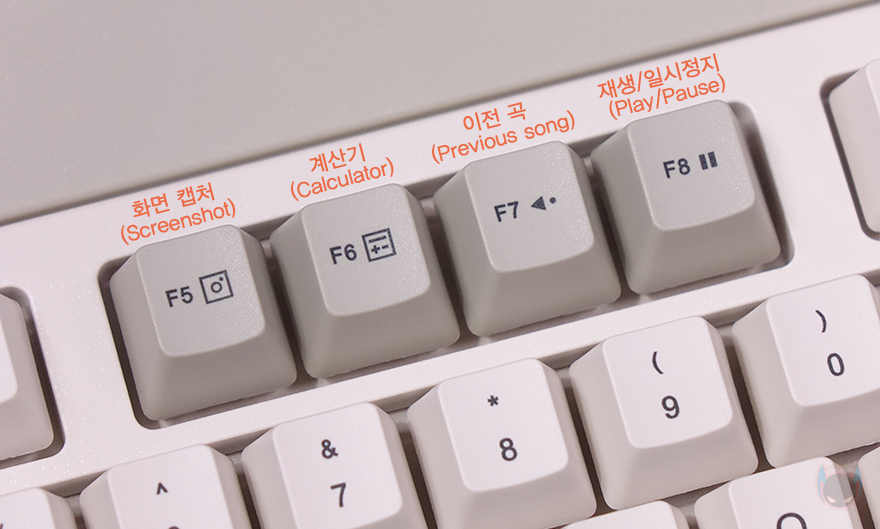 BLOCK 98 키보드 역시 Fn 키 조합으로 부가 기능을 지원하는데, 바로 뒤에서 확인하겠지만, 자판 레이아웃도 윈도우(Win)와 맥(Mac) 운영체제에 맞게 선택할 수 있습니다. 부가 기능에는 F1~F2키는 화면 밝기조절, F3키는 화면/창 전환, F4키는 검색, F5키는 스크린샷, F6키는 계산기, F7~F9키는 재생 컨트롤(Media play control), F10키는 음소거, F11~F12키는 볼륨조절 기능을 가졌습니다. 참고로, 맥(Mac) 레이아웃 사용할 때는 F5키 스크린샷과 F6키 계산기 기능이 작동되지 않습니다. 이외에도 숫자키 1~3까지는 블루투스 디바이스(Bluetooth device), 숫자키 4는 무선 2.4G 연결, 상하(▲▼) 방향키는 백라이트 밝기조절, 좌우(◀▶) 방향키는 백라이트 모드 전환 기능을 가졌습니다.