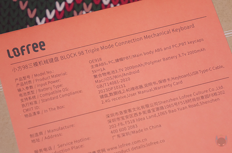 제품 패키지부터 살펴보면, 이미 앞서 피스커뮤를 통해 Lofree(로프리)의 다른 제품들을 만나봤듯이 거의 모든 제품이 박스 패키지이며, 비닐까지 밀봉처리된 경우가 많습니다. BLOCK 98 키보드 역시 박스 패키지로 비닐 밀봉까지 적용되었죠. 그리고, 박스 디자인도 클래식(Classic) 콘셉트에 어울리게 박스 본연의 색상에다가 라벨 종이를 끼워놨는데, 라벨 종이는 박스와 대비되게 컬러 디자인에 모델명과 콘셉트 문구 'Back to Classic'를 확인할 수 있죠. 그리고, 라벨종이 후면에는 제품의 기본 사양 표기를 확인할 수 있는데, 배터리 용량부터 키캡, 구성품 목록을 확인할 수 있습니다.