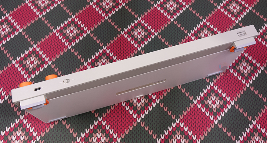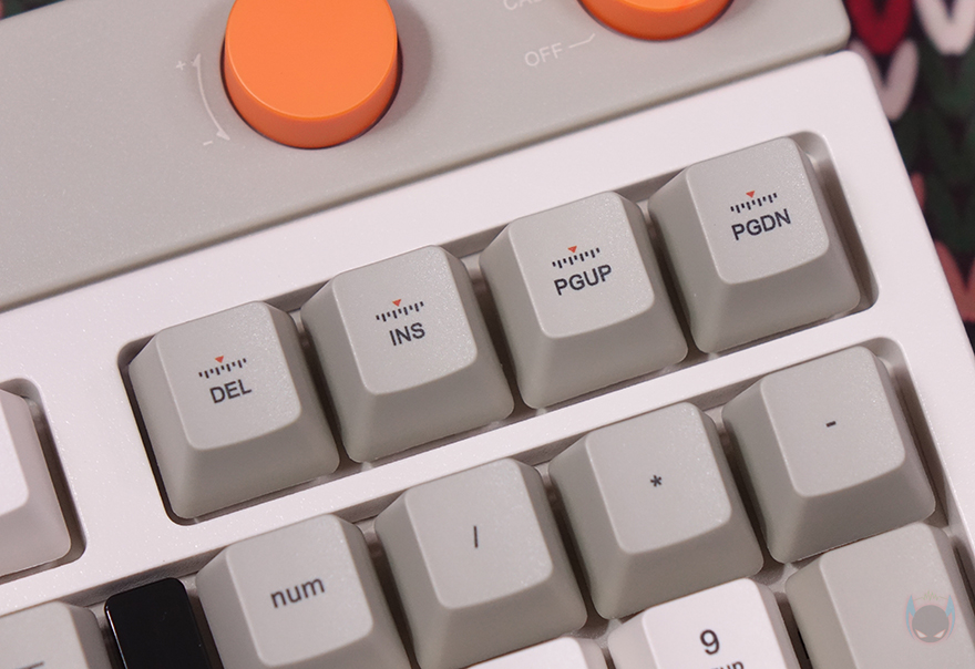 방금 언급했듯이 BLOCK 98 키보드는 98키98 키 배열로, 일반적인 풀-배열 키보드보다 크기는 줄이면서 최대한 풀-배열에 가깝게 채운 것이 98 키 배열인데, BLOCK 98도 그 특징을 그대로 담고 있죠. 일반적으로 숫자키패드 왼쪽 공간이 방향키와 9개의 특수키 자리인데, 그 자리를 최대한 줄였습니다. 그리고, 엔터(Enter) 키와의 사이에는 키보드 기능 활성화 유무와 배터리 잔량을 육안으로 쉽게 확인할 수 있게 패널 인디케이터(Panel Indicator)를 적용했습니다. 그리고, 숫자키패드 바로 위에는 특수키 4개를 배치해 놨으며, 그 바로 위에는 2개의 노브(Knob) 컨트롤러가 오렌지(Orange) 색상으로 포인트를 주고 있는데, 왼쪽 노브는 볼륨 조절(Volume control), 오른쪽 노브는 전원(Power) Off 및 연결모드 기능으로 CAB은 유선(wired) 모드, WLS는 무선(Wireless) 모드로 무선 2.4G와 블루투스(Bluetooth) 2가지 모드를 사용할 때 선택합니다. 그리고, 같은 위치에 맨 왼쪽에는 Lofree 로고(logo)를 새겨놨죠.