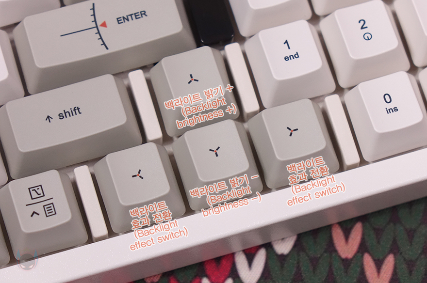 앞서 스위치부분을 살펴볼 때, BLOCK 98 키보드에는 백라이트(Backlight)가 적용되어 있다고 언급했죠. 단색인 화이트(White) 백라이트며, 어두운 곳일수록 더 선명한 효과를 보여줍니다. 그리고, Fn+방향키(▲▼◀▶) 조합으로 기능을 다룰 수 있는데, 상하(▲▼) 방향키는 밝기조절로 Off를 포함해 총 5단계로 조절할 수 있으며, 좌우(◀▶) 방향키는 백라이트 모드전환(Mode switch)을 확인할 수 있는데, 총 14가지 모드를 제공해주며, 이전 모드와 다음 모드로 자유롭게 변경할 수 있습니다.