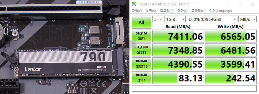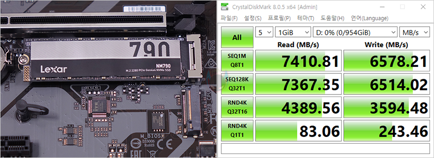 끝으로, B650M K 메인보드에는 M.2 SSD 슬롯이 2개 있죠. 2 슬롯 모두 최대 PCIe 4.0x4 규격을 지원하기 때문에, PCIe 4.0x4 규격의 SSD를 장착해서 각각 속도성능을 확인해 봤습니다. CrystalDiskMark를 통해 각 슬롯의 읽기와 쓰기 속도를 확인해 본 결과, PCIe 4.0x4 규격에서 나올 수 있는 최대 읽기 7000MB/s대와 최대 쓰기 6000MB/s 속도를 확인할 수 있습니다.