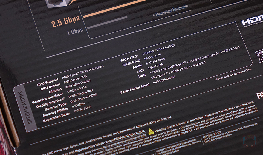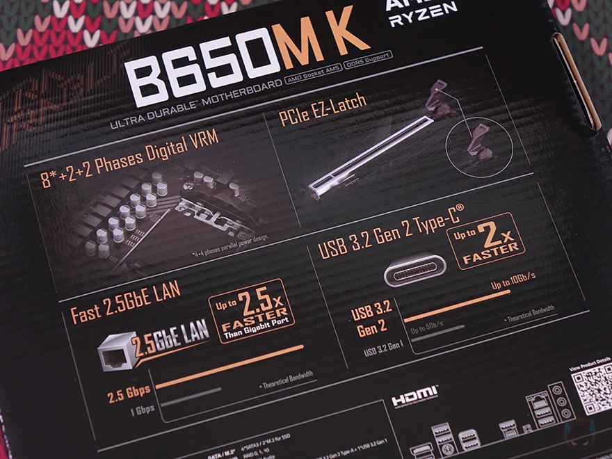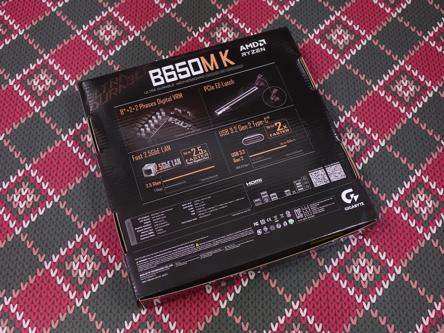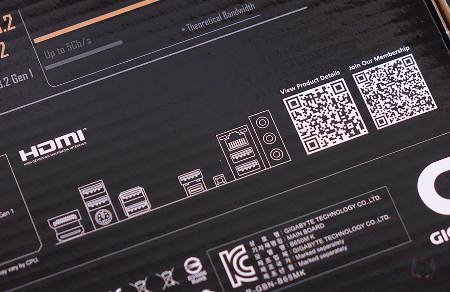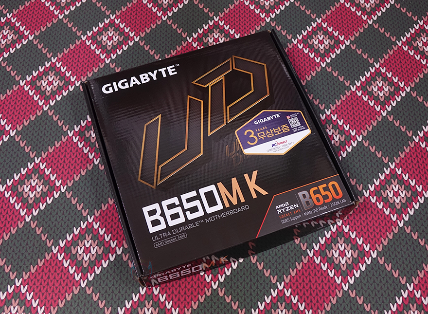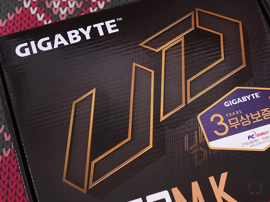 제품 박스부터 살펴보면, 박스 전면에는 UD라는 문구를 크게 새겨놨는데, 기가바이트 B650M K는 시작에서 언급했듯이 보급형대 메인보드로 출시한 제품입니다. 그리고, 이런 보급형 메인보드 즉 기가바이트 메인보드의 가장 기본이 되는 라인업 시리즈가 바로 ULTRA DURABLE 즉 UD 시리즈죠. 그래서, B650M K 모델명 표기 아래에도 ULTRA DURABLE 메인보드라고 표기를 해놨습니다. 물론, 가장 기본 모델이고 보급형 메인보드라도 무상 보증기간은 고급형과 마찬가지로 3년 무상을 지원해줍니다. 박스에도 국내 정식수입사인 (주)피씨디렉트 3년 무상보증 스티커가 부착되어 있죠.