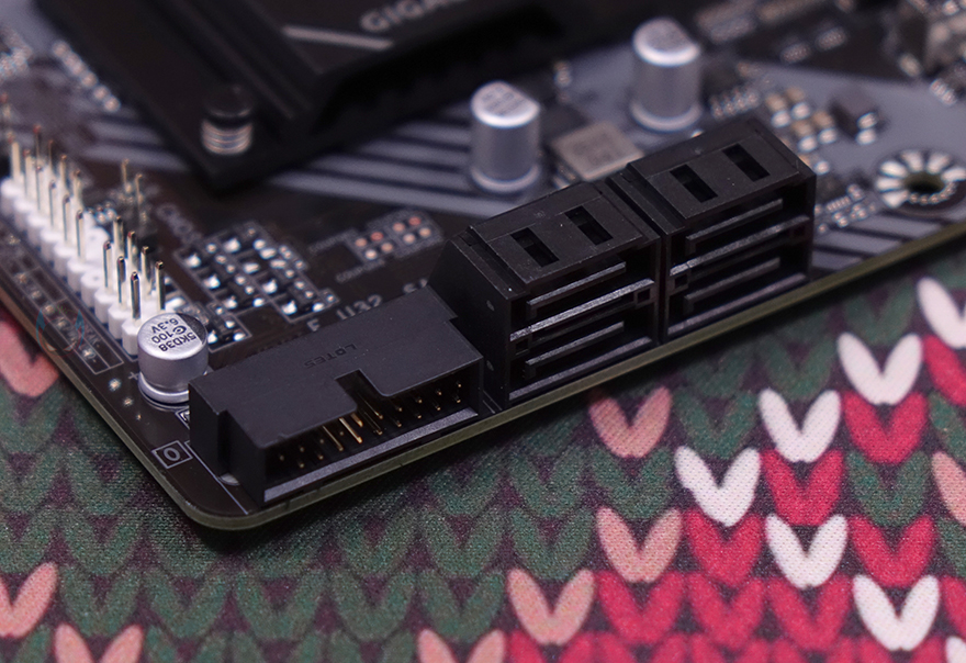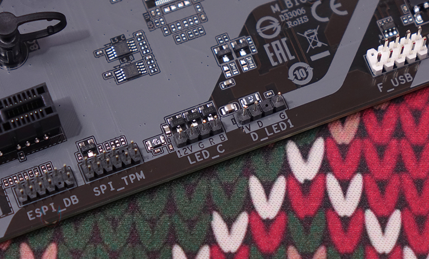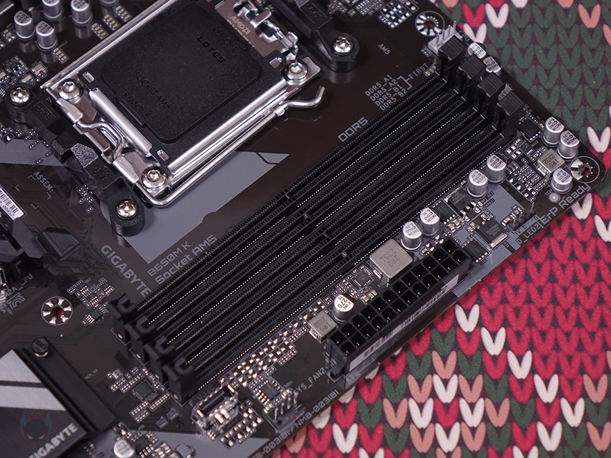메모리 슬롯은 DDR5 규격 지원으로 총 4개 슬롯 구성에 논바이너리 메모리까지 지원해서 최대 192GB 용량을 갖출 수 있으며, 클럭 역시 B650 칩셋 기반으로 오버클럭이 가능하기 때문에 XMP 프로파일의 고급럭 메모리까지 지원해 8000MHz 클럭까지 기가바이트 홈페이지 메모리 호환성 리스트에 표기해 놨습니다. 메모리 슬롯 주변에는 RGB Sync 지원으로 5V ARGB 헤더 1개와 USB 3.2 Gen1 타입C 포트 헤더가 배치된 것을 확인할 수 있으며, USB 3.2 Gen1 타입A 포트 헤더는 메인보드 맨 오른쪽 아래 구석에 SATA 커넥터 4개와 함께 배치되어 있습니다.