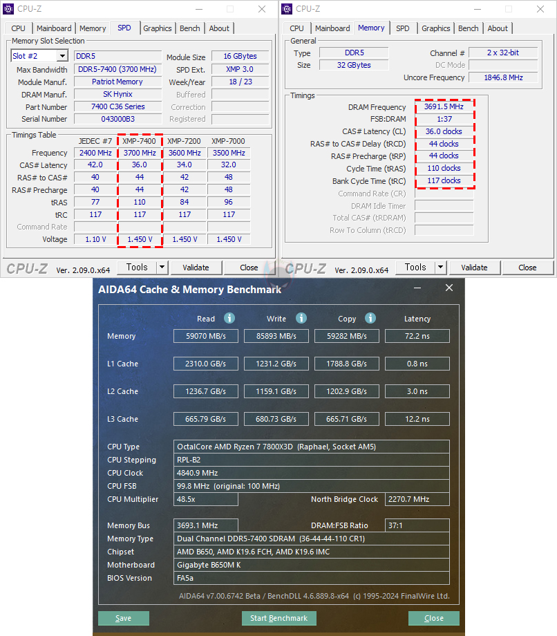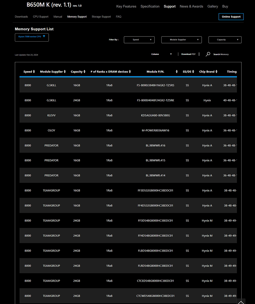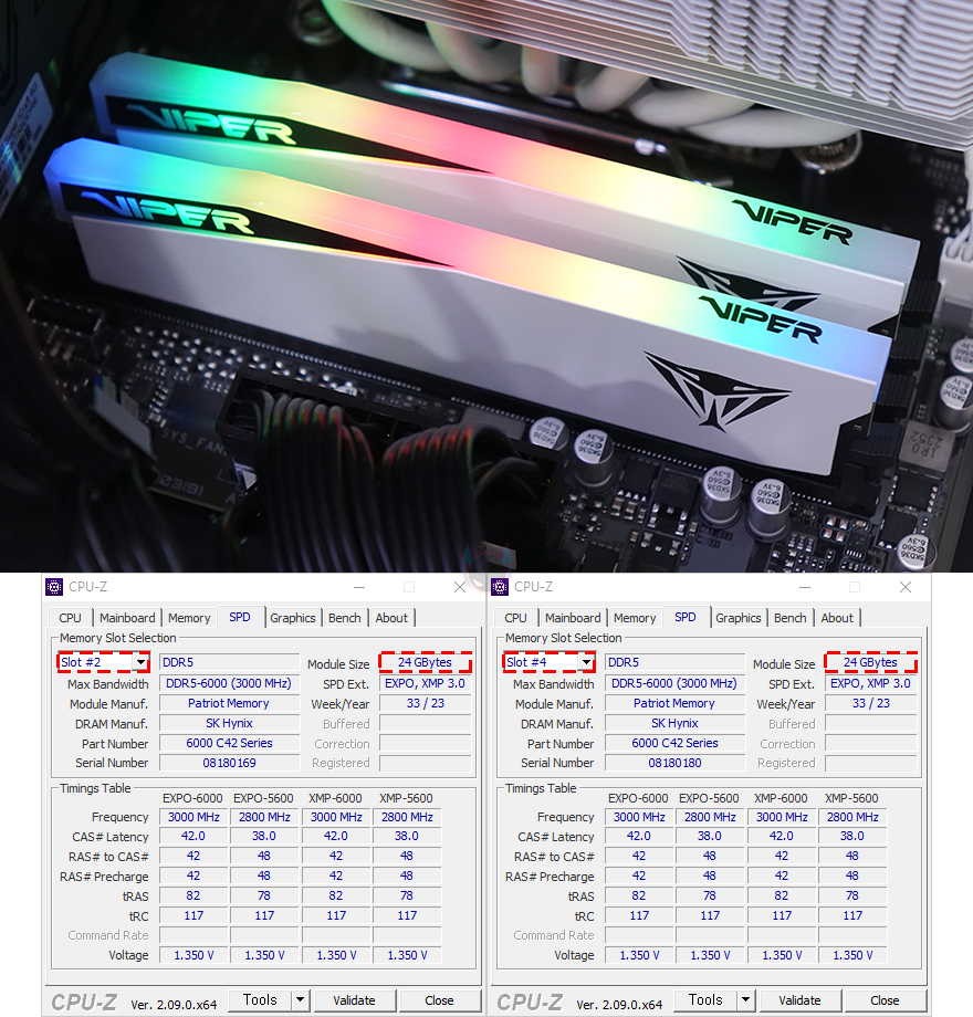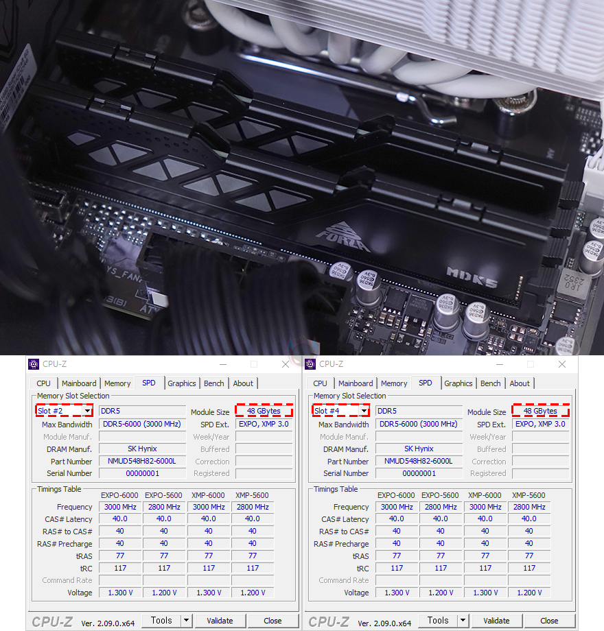 또한, 앞서 언급했듯이 메모리 슬롯은 DDR5 규격을 지원하는데, DDR5에서부터 등장하기 시작한 24GB, 48GB 용량의 논-바이너리 메모리도 B650M K 메인보드에서 완벽하게 적용되는 것을 확인할 수 있습니다. 여기에 메모리 오버클럭도 가능하기 때문에 고클럭이 적용된 XMP 프로파일 DDR5를 사용하면, 프로파일을 불러와서 한 번에 오버클럭을 적용해 사용할 수 있죠.