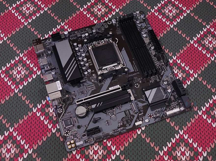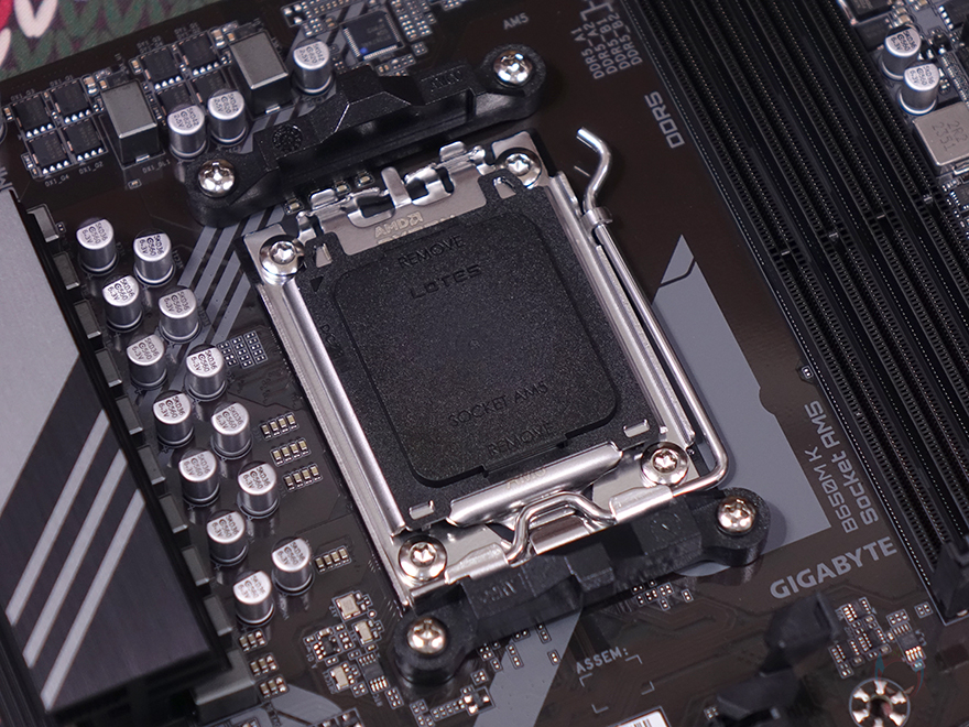 기가바이트 B650M K 메인보드 레이아웃을 살펴보면, M-ATX 폼 규격으로 디자인은 화려하지 않습니다. 흔히 보급형 메인보드에서 볼 수 있는 일반적인 디자인이죠. AMD B650 칩셋 기반이기때문에 당연히 AM5 소켓 규격을 가졌으며, 라이젠 7000 시리즈와 올해 출시한 8000 시리즈 CPU를 지원합니다. 소켓 제조사는 커버에서 알 수 있듯이 LOTES죠. 전원부쪽에는 보급형 모델이지만 발열해결을 위해 방열판 기본 장착을 했으며, 분리해서 보면 안쪽에 써멀패드도 기본 부착되어 있습니다. 전체 전원부 구성은 8+2+2 페이즈로 CPU와 메모리쪽 전원공급에 나름 신경을 썼습니다. 물론, 보급형 메인보드이기 때문에 모스펫은 아날로그 방식, 컨트롤칩셋은 디지털 방식의 하이브리드 디지털 전원부죠.