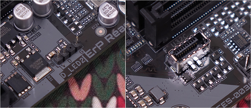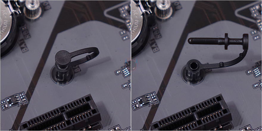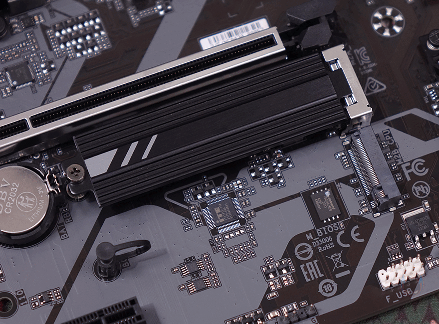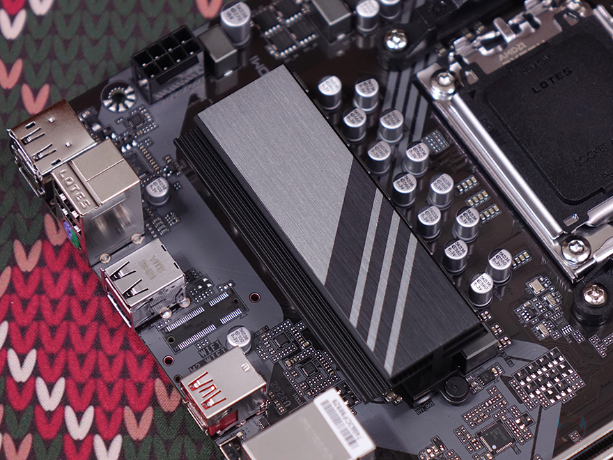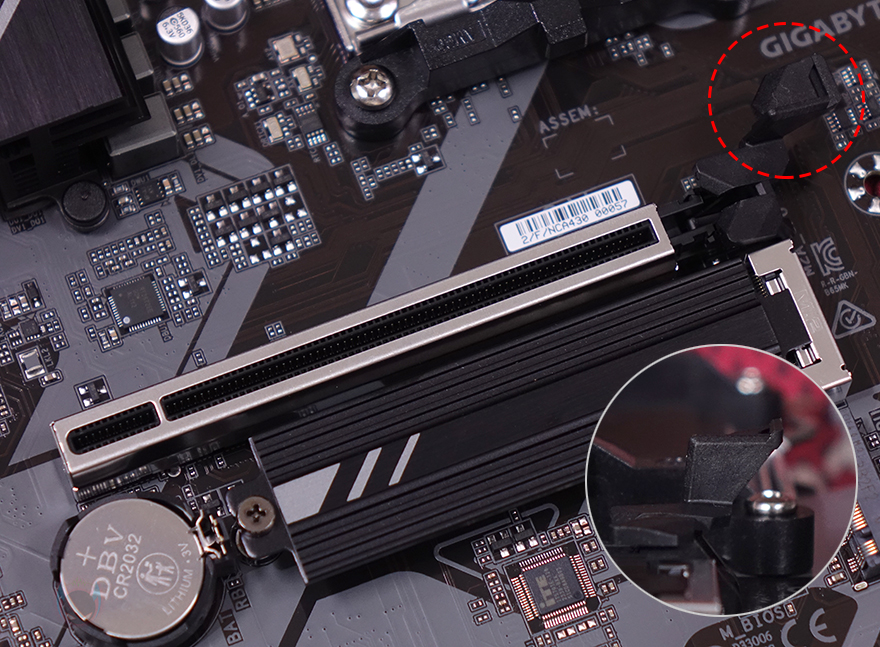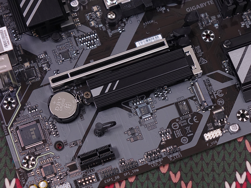 PCIe 슬롯은 2개 구성으로 그래픽카드가 장착되는 1번 PCIe 슬롯은 최대 x16배속으로 슬롯 내구성 강화를 위해 외장에 스틸 커버를 적용했습니다. 또한, 그래픽카드를 쉽게 빼낼 수 있도록 레치 부분을 일반 높이보다 좀 더 높인 EZ-Latch를 적용했죠. 1번 PCIe 슬롯 바로 아래에는 2개의 M.2 SSD 슬롯이 있는데, 1번 M.2 SSD 슬롯에는 방열판이 장착되어 있으며, 바로 아래 2번 M.2 SSD 슬롯에는 무나사 방식으로 핀(Pin)으로 SSD를 장착할 수 있게 갖추고 있습니다. 참고로, M.2 SSD 슬롯 규격은 모두 PCIe 4.0 규격이며, 1번 슬롯은 2280 사이즈까지, 2번 슬롯은 22110 사이즈까지 SSD를 장착할 수 있습니다.