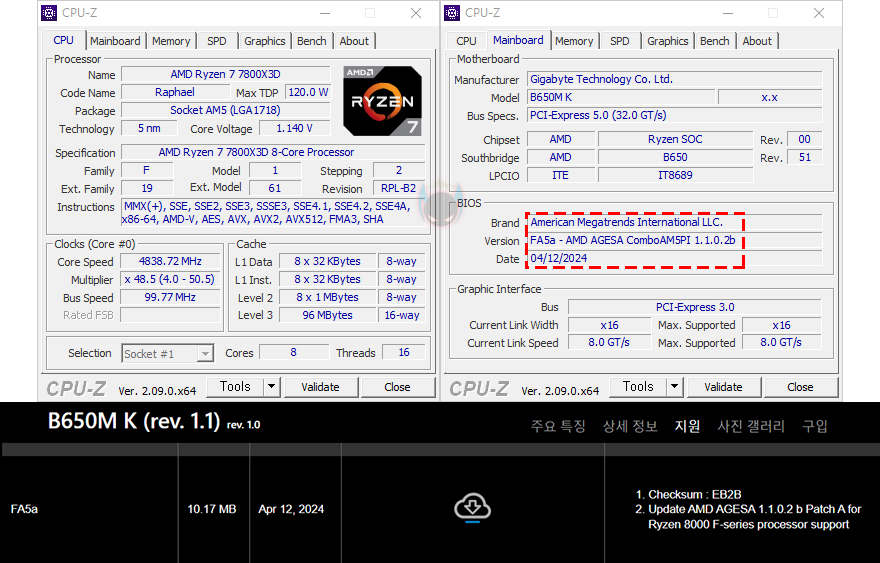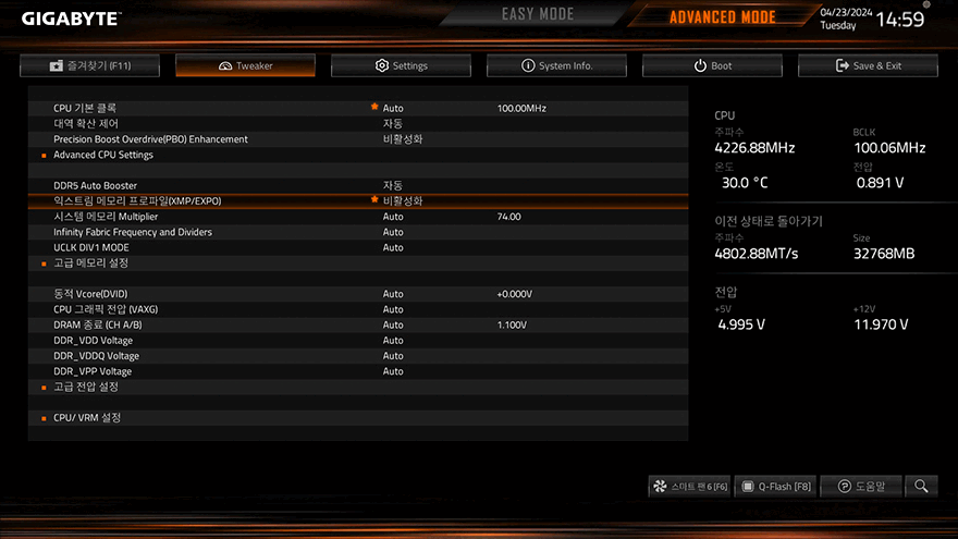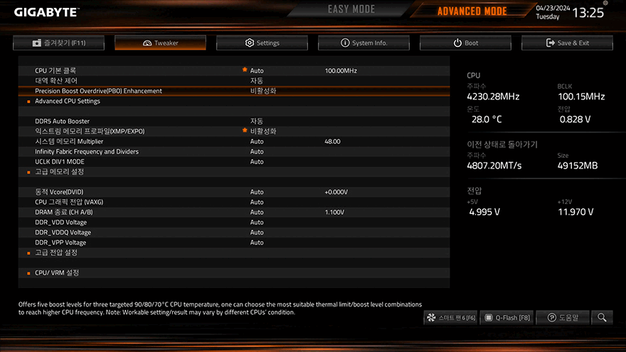 그리고, B650M K 메인보드는 AMD B650 칩셋기반이기 때문에 CPU와 메모리 오버클럭 모두 지원합니다. CMOS-ADVANCED MODE에서 Tweaker 메뉴에서 다룰 수 있는데, AMD 같은 경우에는 라이젠 7000 시리즈부터 배수나 전압설정 같은 수동적인 오버클럭보다는 PBO 및 Curve Optimizer를 사용하는 경우가 더 많죠. 실제로 B650M K 메인보드에서도 이 기능을 다룰 수 있고, 리뷰에 사용된 라이젠 7 7800X3D CPU도 충분히 적용해서 사용할 수 있습니다. 물론, 고성능 CPU를 사용할수록 발열해결을 위한 CPU쿨러도 제대로 갖춰야 합니다.