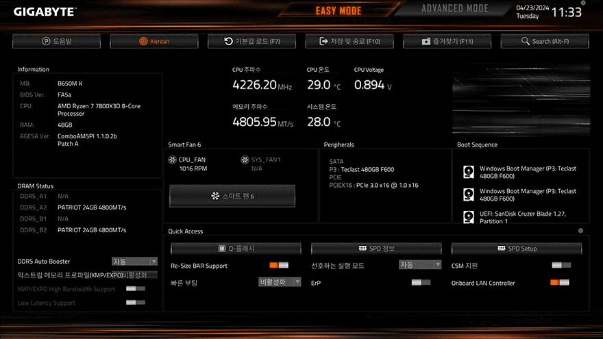 직접 기가바이트 B650M K 메인보드를 사용해 몇 가지 기능 지원들을 살펴보면, 일단 CPU는 현재 AMD CPU에서 가장 인기가 많은 라이젠 7 7800X3D를 사용했으며, B650M K 바이오스 같은경우 최신 버전으로 업데이트하면 가장 최근에 출시한 라이젠 8000F 시리즈까지 장착 사용할 수 있습니다. 그리고, AGESA 1.1.0.2b가 포함된 상태이기 때문에 뒤에서 확인하겠지만 고클럭 XMP 프로파일의 DDR5 메모리도 사용 가능하죠. 또한, 바이오스 CMOS 메뉴 같은 경우도 기가바이트 메인보드 라인업에 따라 인터페이스 디자인 차이가 있지만, 메뉴 구성은 큰 차이가 없으며, B650M K 메인보드 역시 F2키를 통해 EASY MODE와 ADVANCED MODE 전환을 할 수 있습니다.