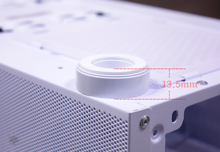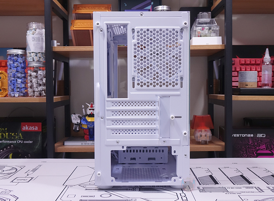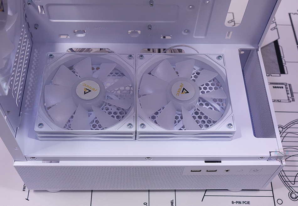 내부 상단에는 앞서 외부에서 잠깐 확인했던 상단 쿨링시스템의 120mm 팬 2개를 다시 확인할 수 있는데, 케이스 색상에 맞춰 화이트 색상이며, RGB 팬이기 때문에 팬 날개도 반투명으로 적용되어 있습니다. 내부 하단의 파워서플라이 커버 상단에도 하단 쿨링시스템으로 120mm 팬이 2개 기본 장착되어 있는데, 디자인은 상단과 동일하나 팬 날개가 반대인 리버스 팬을 적용하고 있죠. 쉽게 말해, 하단에서 외부 공기를 유입해 상단과 후면으로 공기가 배출되는 쿨링시스템입니다. 내부 후면 역시 120mm 팬이며 상단 팬과 동일합니다. 그리고, PCI 슬롯가이드는 모두 일회용이지만, 앞서 구성품에서 확인했듯이 재사용이 가능한 탈착용 2개가 제공되기 때문에 슬롯가이드 낭비는 없습니다.