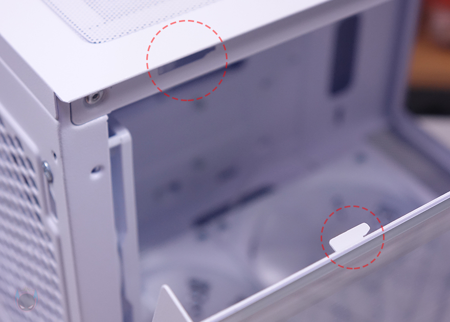 그리고, 사이드패널 정확히는 전면 기준으로 왼쪽 사이드패널도 전면과 동일한 디자인으로 그대로 이어지는 형태입니다. 2/3 영역은 강화유리 패널이 적용되었는데, 후면 나사 고정방식으로 손나사를 사용했으며, 나사를 풀어도 바로 분리되는 게 아닌 후방향으로 슬라이딩으로 밀어야 분리가 되는 방식이라 나사를 풀었을 때 강화유리가 떨어질 위험은 없습니다. 물론, 안쪽 위아래에도 낙하방지를 위한 걸쇠 프레임을 적용해 놨고, 테두리 부분에는 슬라이딩으로 인한 파손방지를 위해 안쪽에도 샤시 프레임을 적용해 놨죠.