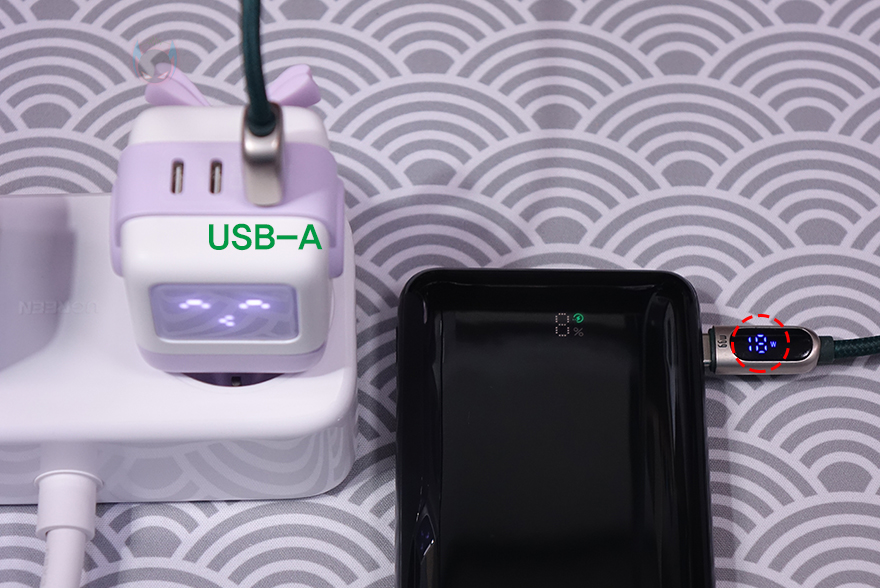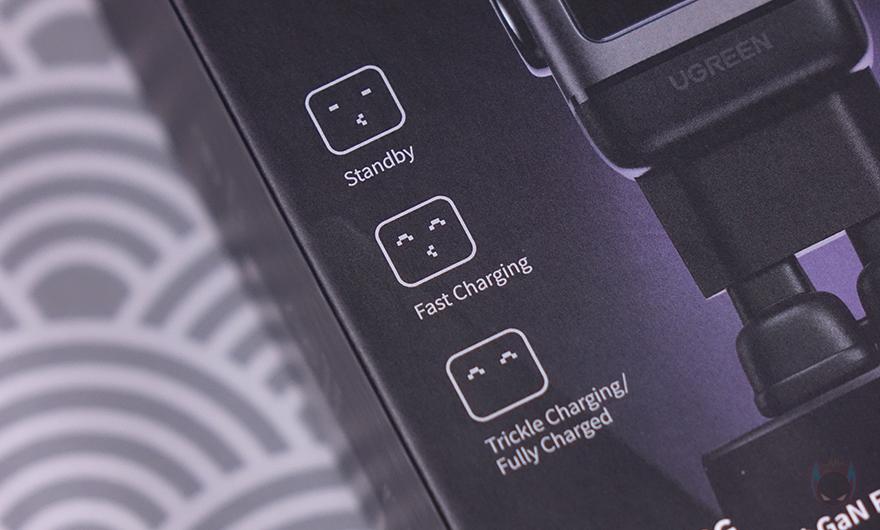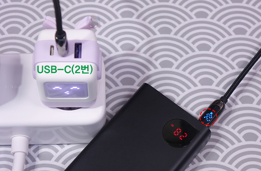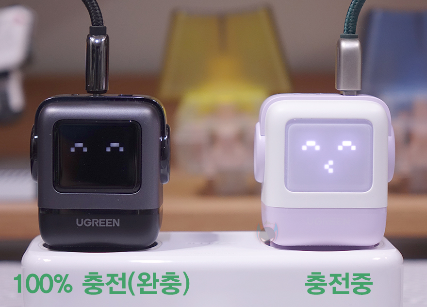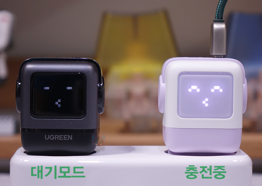 그럼, 직접 유그린(UGREEN) Nexode RG 65W 고속 충전기를 사용해 봐야겠죠?! 충전기를 콘센트에 장착하면 바로 전면에 배치된 LED 디스플레이에 눈/코 모양의 이모티콘(emoticon)이 켜집니다. 눈에 띄는 점은 블랙과 퍼플색상 제품에 따라 LED 디스플레이 배경색 차이가 있는데, 블랙색상 같은 경우에는 배경이 어둡기때문에 굳이 LED를 많이 밝게하지 않아도 뚜렷이 볼일정도의 밝기만 적용했으며, 반대로 퍼플색상 같은경우 배경색이 밝기 때문에 LED가 뚜렷이 보이도록 블랙색상의 LED보다 더 밝게 적용된 것을 확인할 수 있습니다. 세심한 부분까지 신경 쓴 거죠. 그리고, 이모티콘(emoticon) 같은 경우에도 대기상태와 충전상태 그리고 완충상태일 때 달라지는 것을 확인할 수 있습니다.
