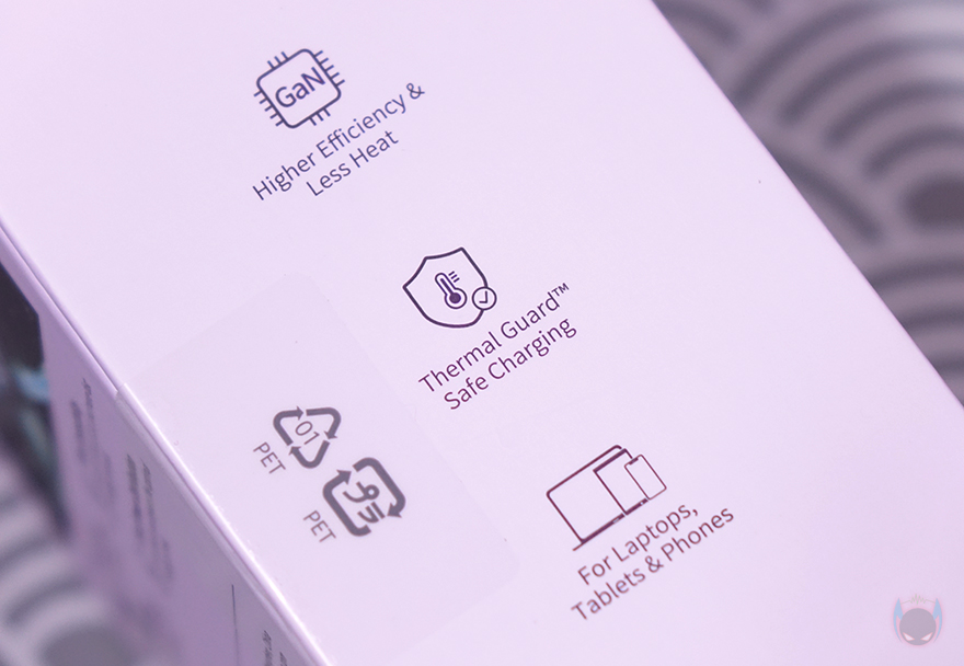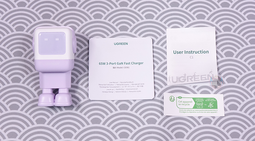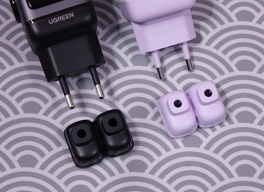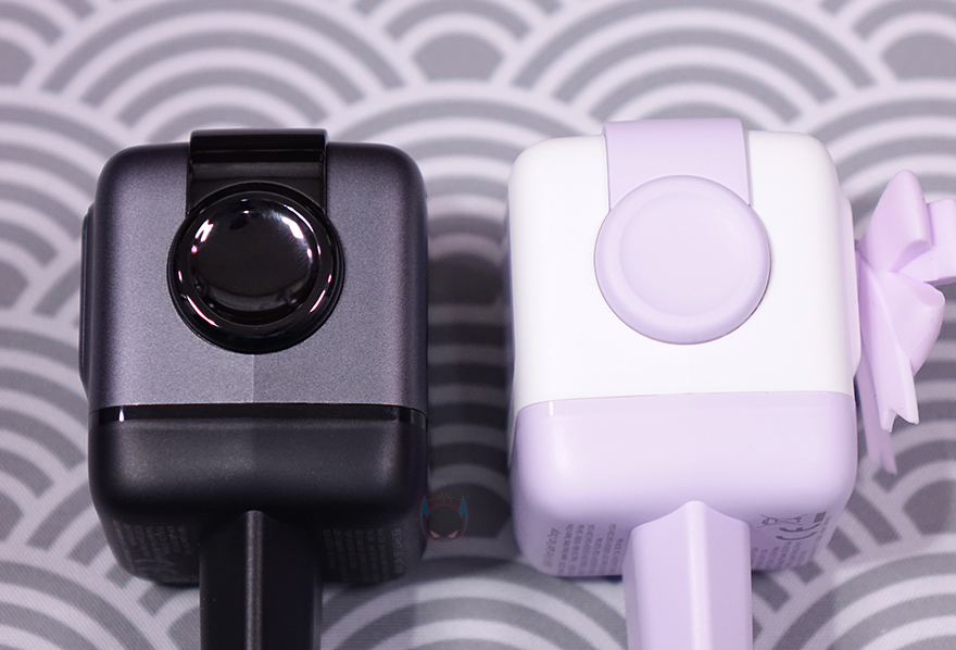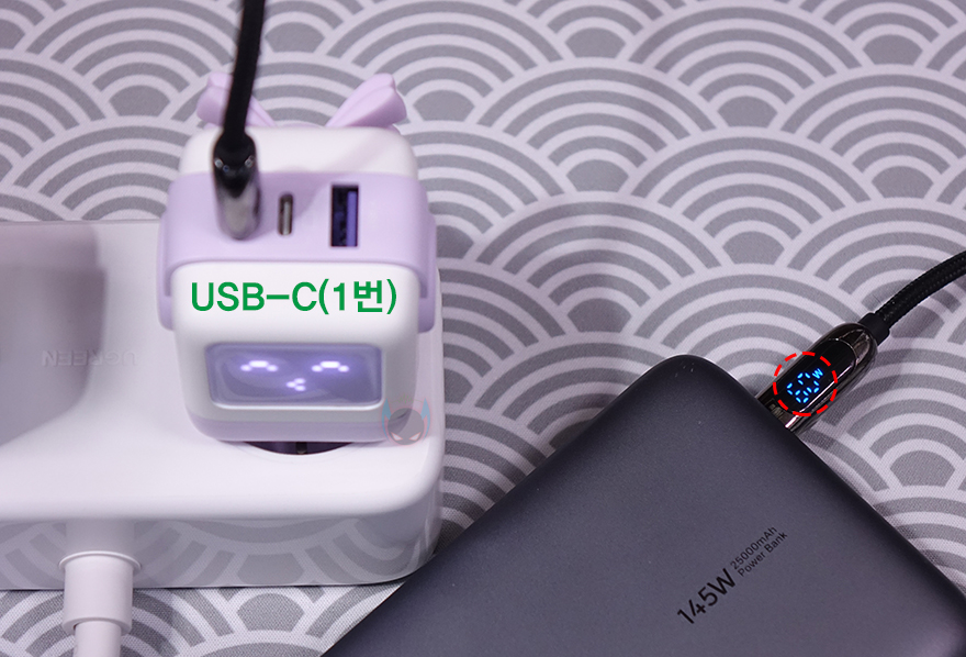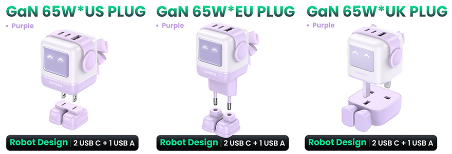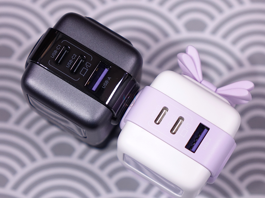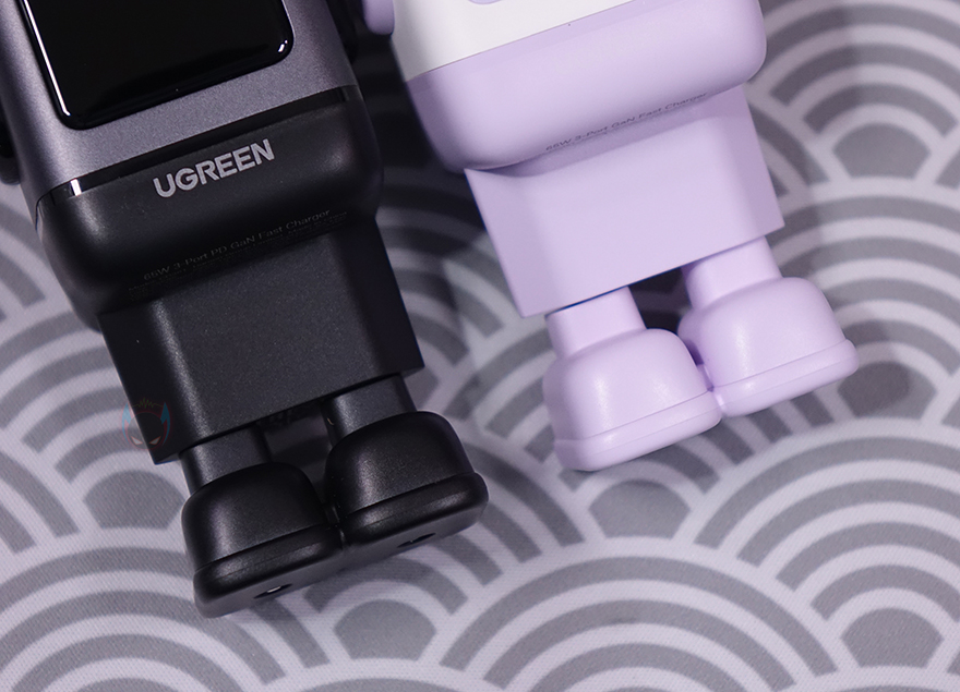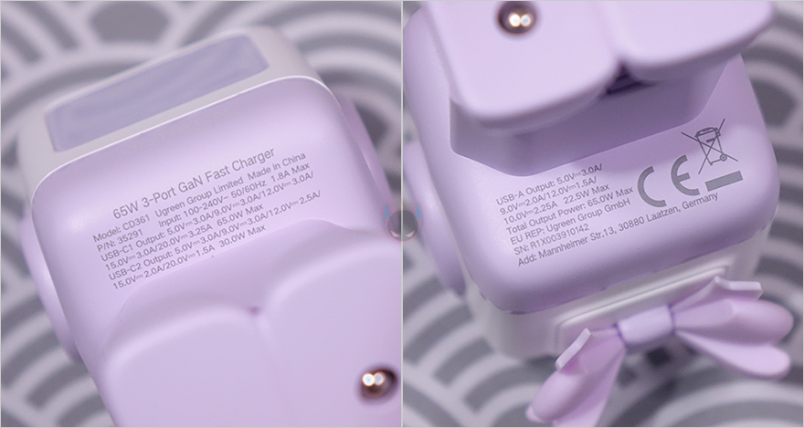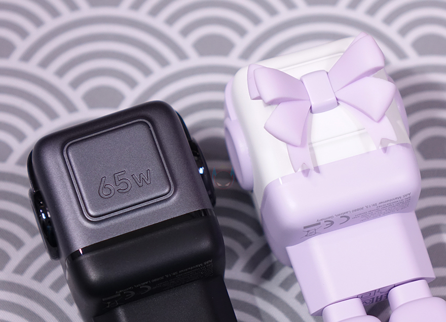 그리고, 후면은 완전히 디자인이 다른데, 블랙색상 제품은 65W 충전 표기를 해놨으며, 퍼플색상 제품은 리본 디자인을 적용했습니다. 그래서, 블랙색상은 남성 캐릭터 느낌을, 퍼플색상은 여성 캐릭터 느낌으로 구분되죠. 참고로 리본 부분은 고무 질감으로 말랑말랑합니다. 또한, 충전기 상단에는 USB 충전포트가 배치되어 있는데, USB Type-C 포트 2개와 Type-A 포트 1개 구성으로 총 3 포트입니다. Type-C 포트 1번은 최대 65W를 지원하며, 2번 Type-C 포트는 최대 30W, Type-A 포트는 최대 22.5W를 지원합니다. 물론, 단일 포트로만 사용했을 때 기준이고, 2 포트와 3 포트를 사용할 때는 충전속도가 낮아지면서 분배되는데, 로봇 얼굴 아래 그러니깐 플러그와 경계되는 부분에 충전 지원표기를 확인할 수 있습니다.