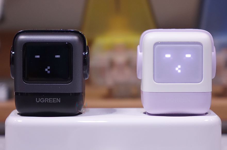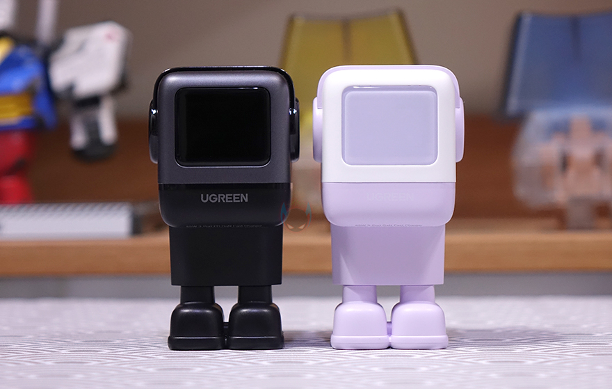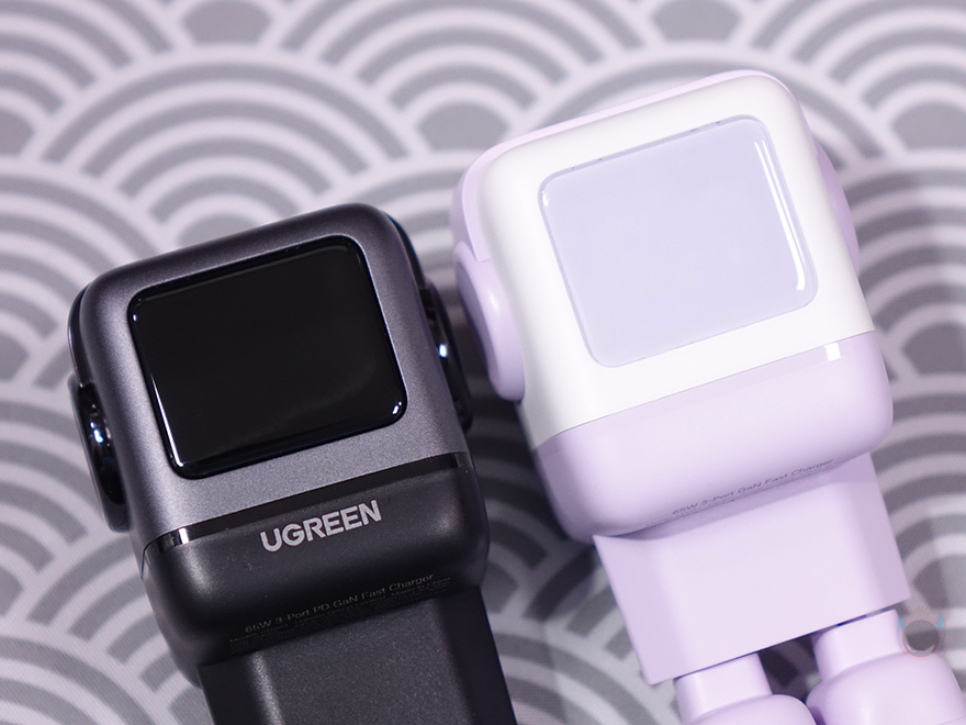 유그린(UGREEN) Nexode RG 65W 고속 충전기를 살펴보면, 일단 색상은 앞서 언급했듯이 블랙과 퍼플 2가지 색상으로 출시되었습니다. 정확히는 각 색상별로 투톤 컬러를 가지고 있는데, 블랙색상은 블랙과 그레이 계열로, 퍼플 색상은 퍼플와 화이트 계열로 적용되어 있습니다. 그리고, 한눈에 봐도 제품 디자인이 그동안 보던 일반적인 충전기와는 다르죠. 뒤에서 확인하겠지만, 전면에는 충전 상태에 따라서 쉽게 확인할 수 있는 LED 디스플레이가 배치되어 있는데, 이 부분을 통해 전체적인 디자인 감성이 로봇(Robot) 감성으로 느끼게 해 줍니다. 그리고, 두 제품 디자인에 약간의 차이도 있는데, 블랙색상 같은 경우에는 LED 디스플레이 아래에 UGREEN 로고(logo)를 새겨놨고, 측면에서 보면 마치 로봇 얼굴에 헤드셋을 착용한 형상의 디자인을 적용하고 잇는데, 블랙색상 제품은 유광처리를, 퍼플색상 제품은 무광으로 처리되어 있습니다.