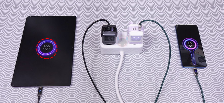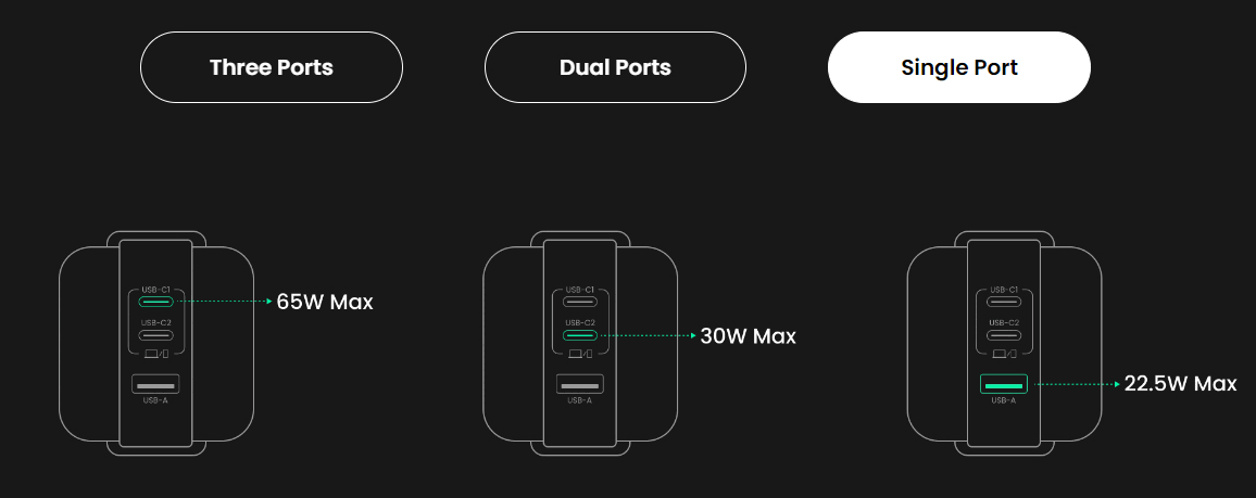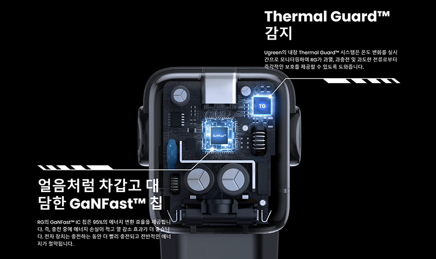 끝으로, Nexode RG 65W 고속 충전기의 포트별 충전속도를 확인해 보면, 앞서 언급했듯이 USB Type-C 포트 1번은 최대 65W를 출력하며, 2번 Type-C 포트는 30W, USB Type-A 포트는 22.5W까지 출력하는데 단일포트로 사용했을 시 모두 근접한 값으로 출력되는 것을 확인할 수 있습니다. 그리고, 3개의 포트를 모두 사용하면 이보다 낮은 출력으로 분배되는 것도 확인할 수 있죠. 참고로, Nexode RG 65W 고속 충전기 내부에는 고속 충전 컨트롤을 위한 GaN IC칩과 더불어 앞서 주요 특징 표기에서 확인했던 스마트 배전 즉 과열/과전류/과충전 등 방지를 위한 보호회로 칩이 내장되어 있습니다.
