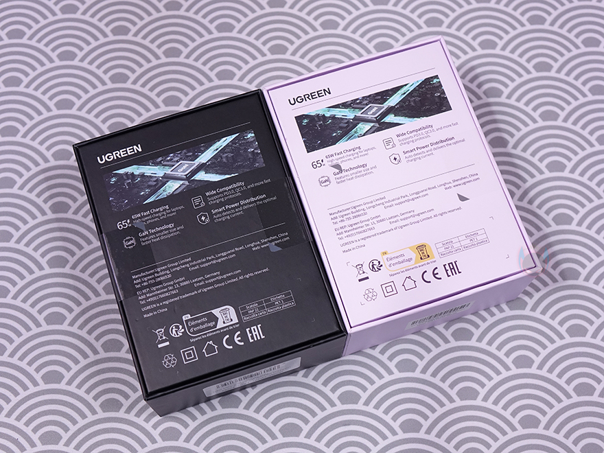 제품 패키지부터 살펴보면, 뒤에서 확인하겠지만, Nexode RG 65W 고속 충전기는 블랙과 퍼플 2가지 색상으로 출시되었습니다. 그래서, 제품 색상에 맞춰서 제품 패키지 박스도 그대로 적용하고 있죠. 또한, 제품 박스 전면에 담긴 제품의 이미지도 색상구분대로 담고 있는데, 제품 전면만 담은 이미지라 동일하다 생각할 수 있겠지만, 디자인에 약간의 차이점을 두고 있습니다. 그리고, 제품박스 색상과 제품 이미지는 다르지만, 박스에 담긴 정보들은 동일한데, 일단 제품 이미지 왼쪽에는 이제품의 핵심 중 하나인 충전상태를 보여주는 LED 디스플레이의 상태 표시를 간략하게 설명해 줍니다. 그리고, 아래에는 제품 이름과 포트 개수를 표기해 놨는데, Nexode RG의 RG 단어는 Robot GaN의 줄임말이죠. 그리고, 박스 한쪽 측면에는 제품의 주요 특징, 반대쪽 측면에는 포트별 충전속도를 표기해 놨습니다.