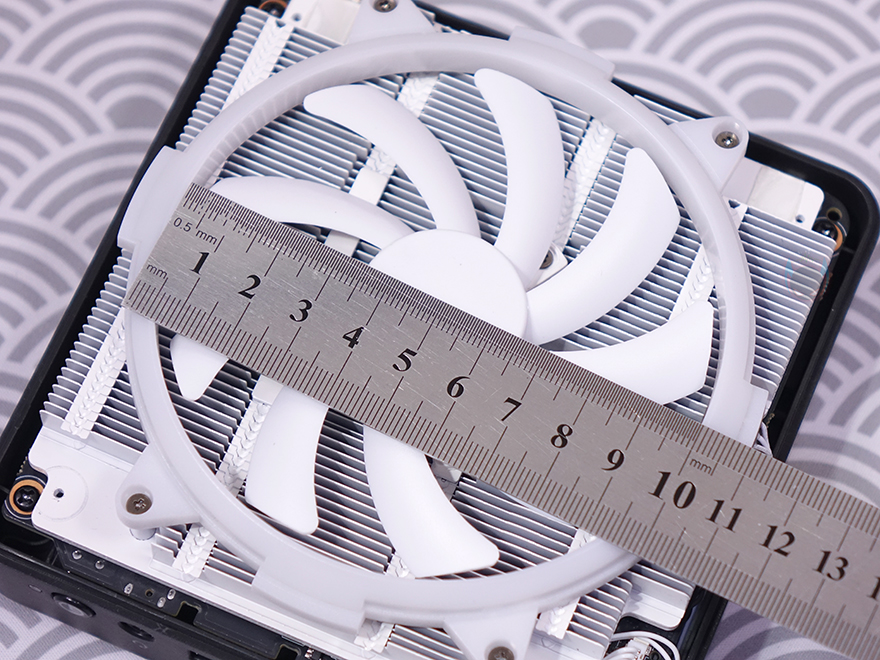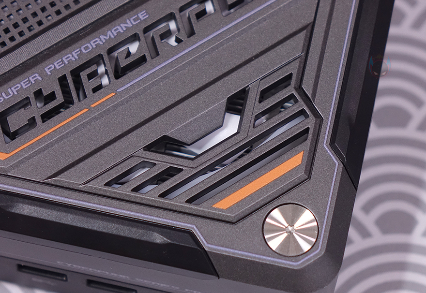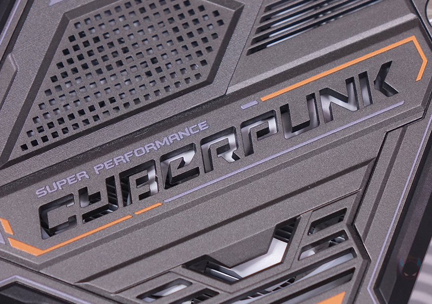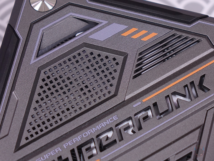본체 상단부터 상세히 살펴보면, 상단은 게이밍(Gaming) 콘셉트를 가장 잘 보여주는 디자인으로 사이버펑크(CYBERPUNK) 문구를 새겨놨는데, 외부 공기가 유입되도록 에어홀처럼 처리했습니다. 그리고, 문구 기준으로 위/아래로도 각각 다른 디자인의 에어홀을 적용했죠. 그리고, 상단 모서리 부근에는 육각나사가 적용되어 있는데, 나사를 풀면 쉽게 상단 커버를 분리할 수 있고, 커버를 분리하면 내부에 상단 쿨링시스템으로 화이트(White) 색상의 방열판(Heatsink)과 팬(Fan)이 장착된 것을 확인할 수 있죠. 정확히는 이 부분 그러니깐 히트싱크 아래에 CPU가 장착되어 있습니다. 그리고, 팬 크기는 약 100mm로 뒤에서 확인하겠지만, RGB 팬이죠.
