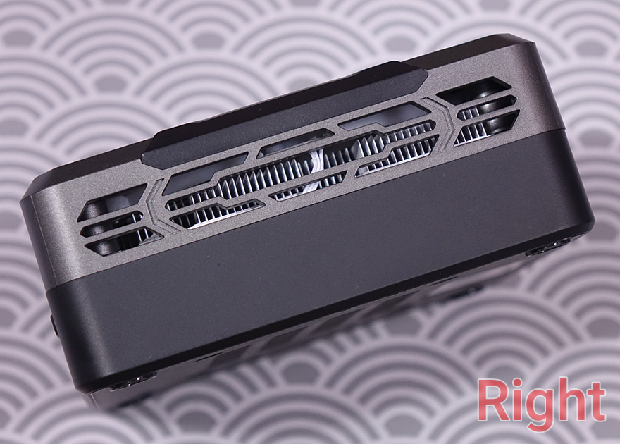 본체 전면에는 버튼(Button) 및 포트(Port)들이 배치되어 있는데, 왼쪽부터 전원 버튼, 오디오(Audio), USB 3.2 포트 2개, USB Type-C 포트 1개, 라이트 모드 버튼순으로 배치되어 있습니다. USB Type-C 포트는 USB 4.0 규격으로 썬더볼트 겸용과 함께 외부 모니터, eGPU, 전원공급 용도로도 사용할 수 있고, 라이트 모드(Light Mode) 버튼은 앞서 확인한 상단 RGB 팬의 LED 효과를 전환할 수 있는 버튼입니다. 그리고, 본체 양쪽 측면에는 역시 측면 쿨링효과를 볼 수 있게 에어홀이 처리되어 있죠.