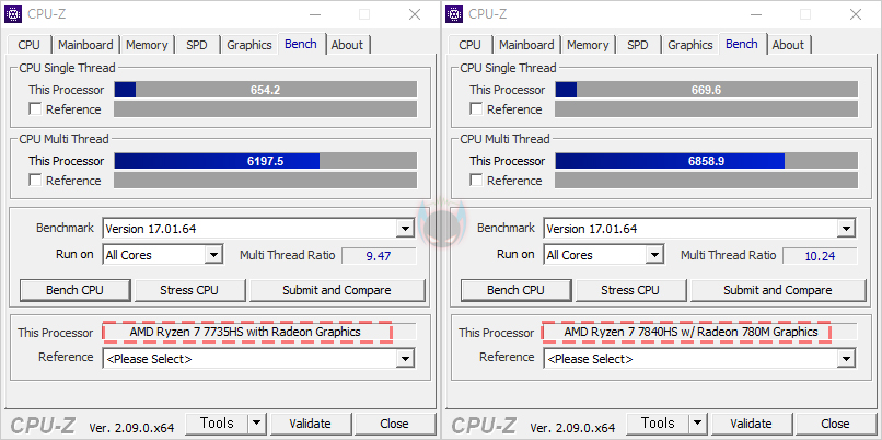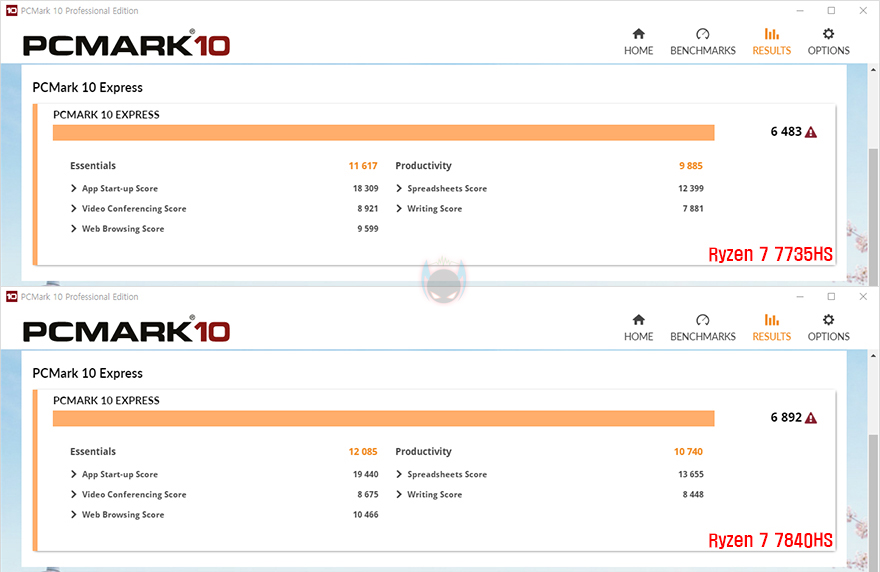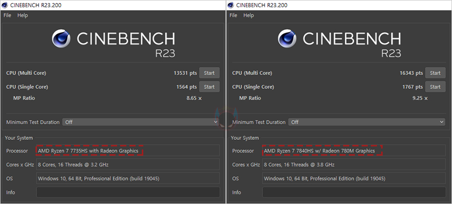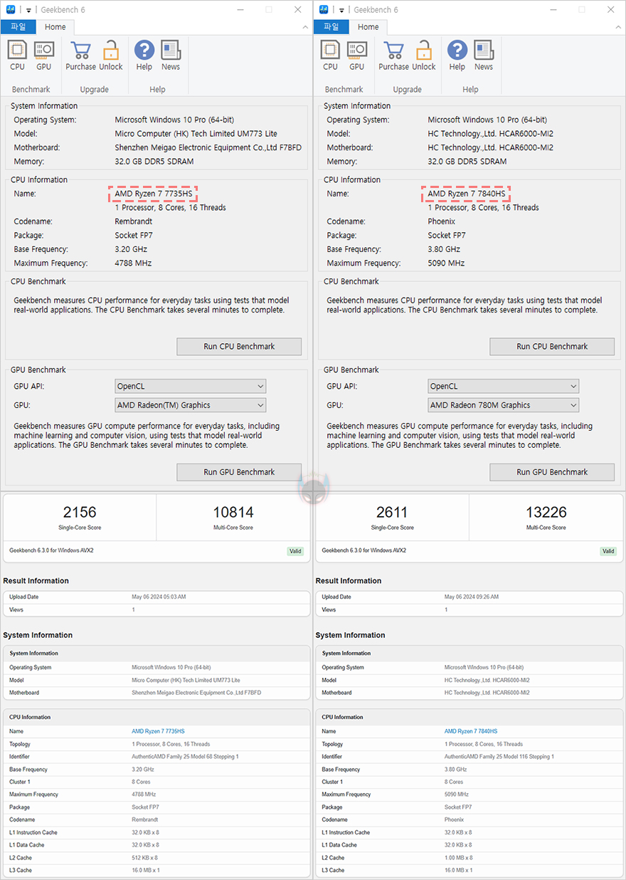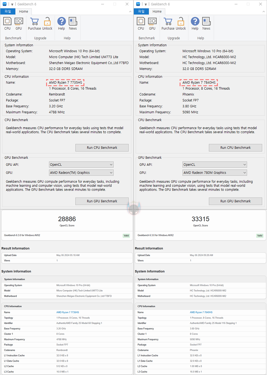 먼저, CPU 부분의 성능을 비교해 보면, CPU-Z의 Bench 항목을 비롯해, Cinebench R23, Geekbench 6 벤치마크 프로그램을 실행해 비교했을 때, 모두 라이젠 7 7840HS가 앞서는 결과를 보여줬습니다. 똑같은 코어와 쓰레드 구조라도 라이젠 7 7735HS의 다음 세대인 CPU인 만큼 성능의 차이가 있음을 보여주죠.