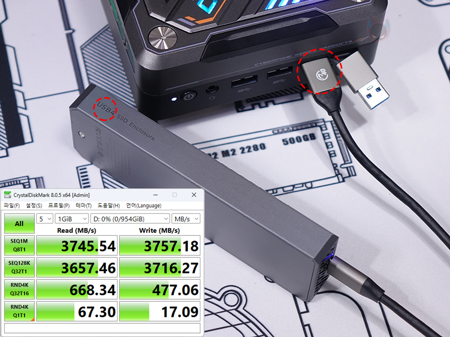 끝으로, AN3 미니 PC의 M.2 SSD 슬롯은 PCIe 4.0 규격을 지원합니다. 정확히는 PCIe 4.0x4 규격까지 지원하죠. 그래서, 장착된 NVMe SSD 역시 PCIe 4.0x4 규격으로 CrystalDiskMark를 통해 성능을 확인해 보면, PCIe 4.0x4 규격상 나오는 최대 읽기와 쓰기 속도대를 확인할 수 있습니다. 그리고, 전면에 USB 4.0 규격의 USB Type-C 포트가 배치된 것을 앞서 확인하면서 언급했는데, USB 4.0 지원의 외장 SSD를 사용하면 역시 외장 SSD로는 최고의 성능으로 사용할 수 있죠. 또한, 외장 모니터 연결로도 사용할 수 있습니다. 참고로, USB 4.0을 제대로 사용하려면 윈도우 11 운영체제를 사용해야 합니다.