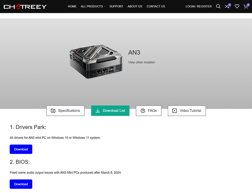 그리고, CHATREEY의 거의 모든 미니 PC는 최소 구매옵션이 No RAM, No Storage부터 시작합니다. AN3 미니PC 역시 마찬가지죠. 그래서, 가장 저렴한 옵션인 No RAM, No Storage로 구매했다면, 사용자가 직접 운영체제를 설치하고, 드라이버 설치도 해야 합니다. 특히, 드라이버 설치 같은 경우 예전에는 판매처나 제조사에 요청에 다운로드 받아야하는 번거로움이 있었는데, 시작에서 잠깐 언급했지만 최근 CHATREEY 가 공식 홈페이지(https://www.chatreey.com/)를 개설했기 때문에 이제는 소비자가 홈페이지에서 쉽게 드라이버 설치파일을 다운로드 받아 한번에 해결할 수 있습니다. 참고로, Chatreey 홈페이지에서 드라이버 설치파일을 다운로드받아 설치한 후에도 일부 드라이버 정확히는 AMD USB 4.0과 인텔 랜 칩셋 드라이버는 AMD와 인텔 홈페이지를 통해 추가 설치해야 합니다.