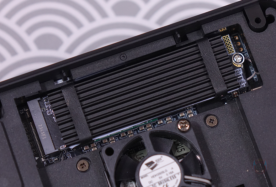 만약, 장착하는 NVMe SSD에 방열판(Heatsink)이 없다면, AN3에서 기본제공해 주는 방열판과 써멀패드(Thermalpad)를 사용하면 되고, 고정은 고무밴드로 해줍니다. 그리고, 중앙에 위치한 팬(Fan)은 35mm 팬으로 배기역할을 하는데, 양쪽에 고정된 나사를 풀면, 팬이 위치한 곳이 전원부에 해당하는 곳임을 확인할 수 있죠. 그래서, 상단에는 CPU 쿨링을 위한 팬 하단에는 전원부 쿨링을 위한 팬으로 AN3는 듀얼 팬(Dual Fan) 구성을 하고 있습니다. 그리고, No RAM, No Storage 옵션으로 구매해서 RAM과 SSD를 장착했다면, 다시 커버를 씌울 때는 제공되는 나사와 받침패드를 사용하면 되죠.