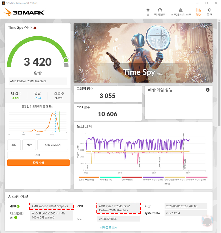 이어서 이번에는 두 CPU에 내장된 그래픽 라데온 680M과 라데온 780M의 성능을 비교해 봤는데, Geekbench 6, 3DMark Fire Strike, Time Spy 항목으로 각각 벤치마크를 실행해 비교해 본 결과, 모두 라데온 780M이 앞서는 결과를 보여줬으며, 제법 큰 차이를 보여줬습니다. 특히, Time Spy 점수 기준으로 보면 라데온 780M의 성능이 데스크톱 그래픽카드의 지포스 GTX1050Ti와 GTX1650 사이의 근접한 점수라는 걸 알 수 있죠. 그래서, 앞서 언급했듯이 최근 미니 PC뿐만 아니라 UMPC에서도 라이젠 7 7840HS 혹은 라데온 780M이 내장된 APU를 많이 사용하고 있습니다.