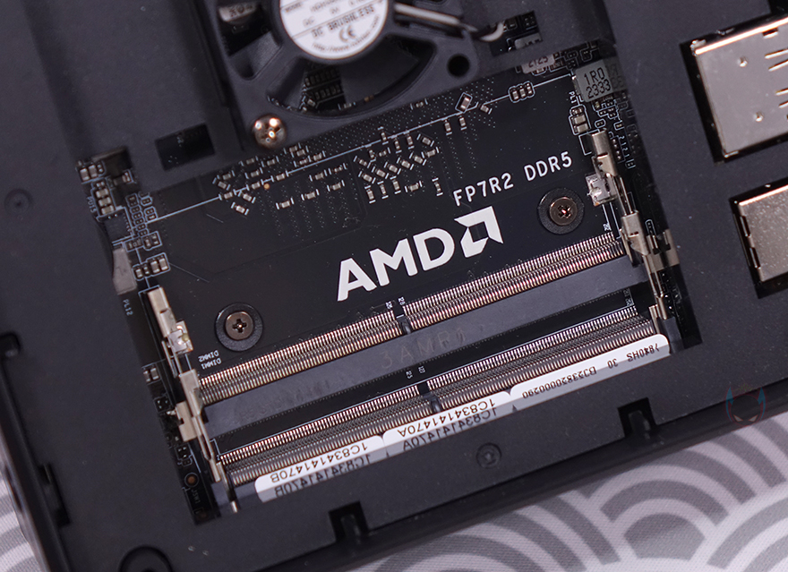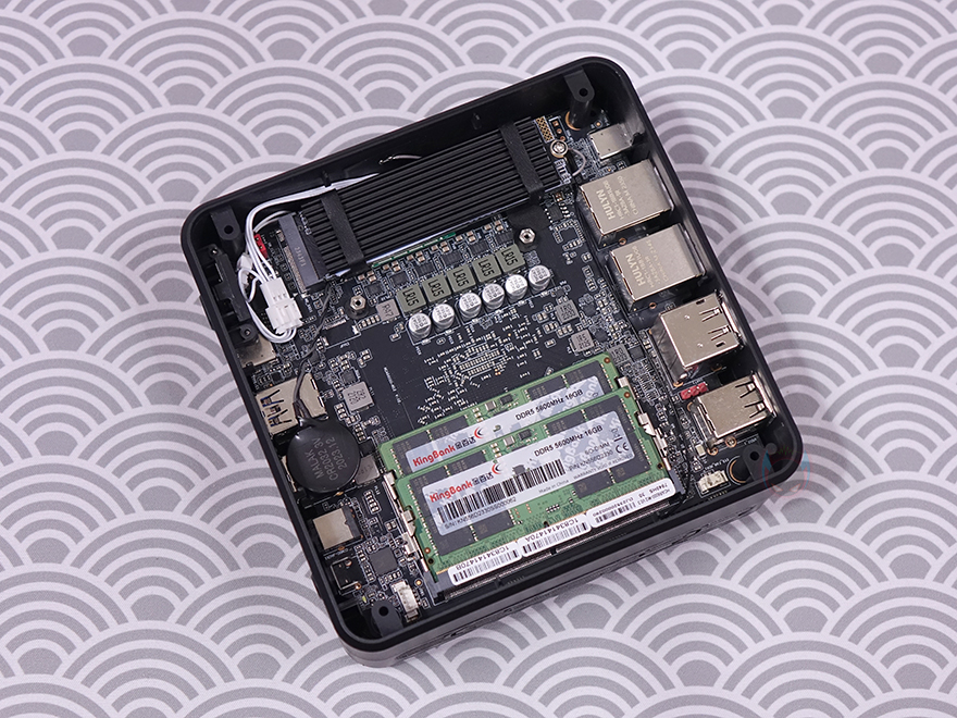 이번엔 AN3 미니 PC의 본체 밑바닥 부분을 살펴보는데, 중앙에는 에어홀 처리가 적용되어 있으며, No RAM, No Storage 옵션기준으로 앞서 언급했듯이 커버 나사가 적용되지 않은 상태이기 때문에 바로 분리가 가능합니다. 그래서, 커버를 분리해서 내부를 살펴보면, 가운데 팬을 기준으로 아랫부분에는 메모리 슬롯 2개가 배치되어 있는데, SODIMM 규격의 DDR5 메모리를 지원합니다. 그리고, 팬 기준 윗부분에는 Wi-Fi 6와 블루투스 5.2 지원의 모듈이 장착된 것을 확인할 수 있으며, 그 위에 2280 사이즈의 M.2 SSD를 장착할 수 있는데, PCIe 4.0 지원의 NVMe SSD를 지원하며 최대 2TB 용량을 지원합니다.