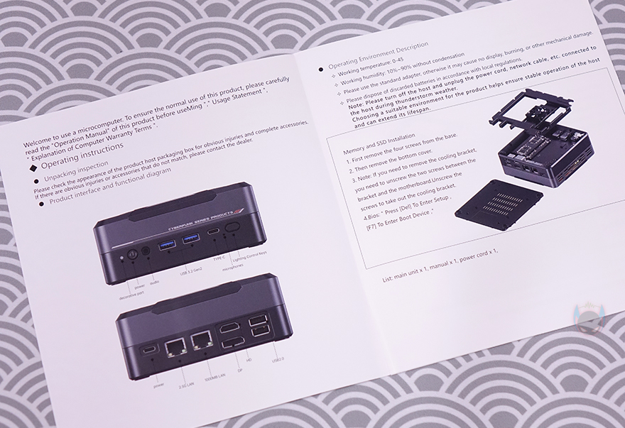 겉표지에는 별다른 추가 정보는 없으며, 겉표지에서 속박스를 꺼내 열어보면, 외부 충격방지를 위한 스펀지 포장재와 함께, 내부에는 좌우로 미니PC 포장공간과 부속품이 들어있는 별도의 박스포장 공간으로 나뉘어 있습니다. 전체 제품 구성에는 AN3 미니 PC, 전원어댑터 및 전원 케이블, HDMI 케이블, SSD 방열판 및 써멀패드, 고무밴드, 커버 나사 및 받침 패드, 제품설명서로 이루어져 있는데, 이 기준은 No RAM, No Storage 옵션 기준이며, RAM와 Storage가 포함된 옵션으로 구매하면 커버 나사와 받침패드가 이미 적용된 상태일 수 있습니다. 제품 설명서에는 간략하제 명칭이랑 RAM, SSD 설치 설명이 담겨 있죠.